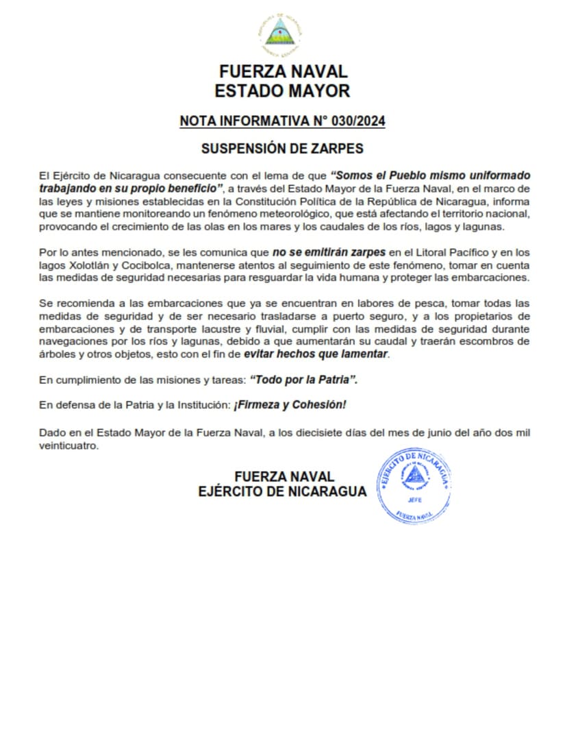Por lo antes mencionado, se les comunica que no se emitirán zarpes en el Litoral Pacífico y en los lagos Xolotlán y Cocibolca, mantenerse atentos al seguimiento de este fenómeno, tomar en cuenta las medidas de seguridad necesarias para resguardar la vida humana y proteger las embarcaciones.