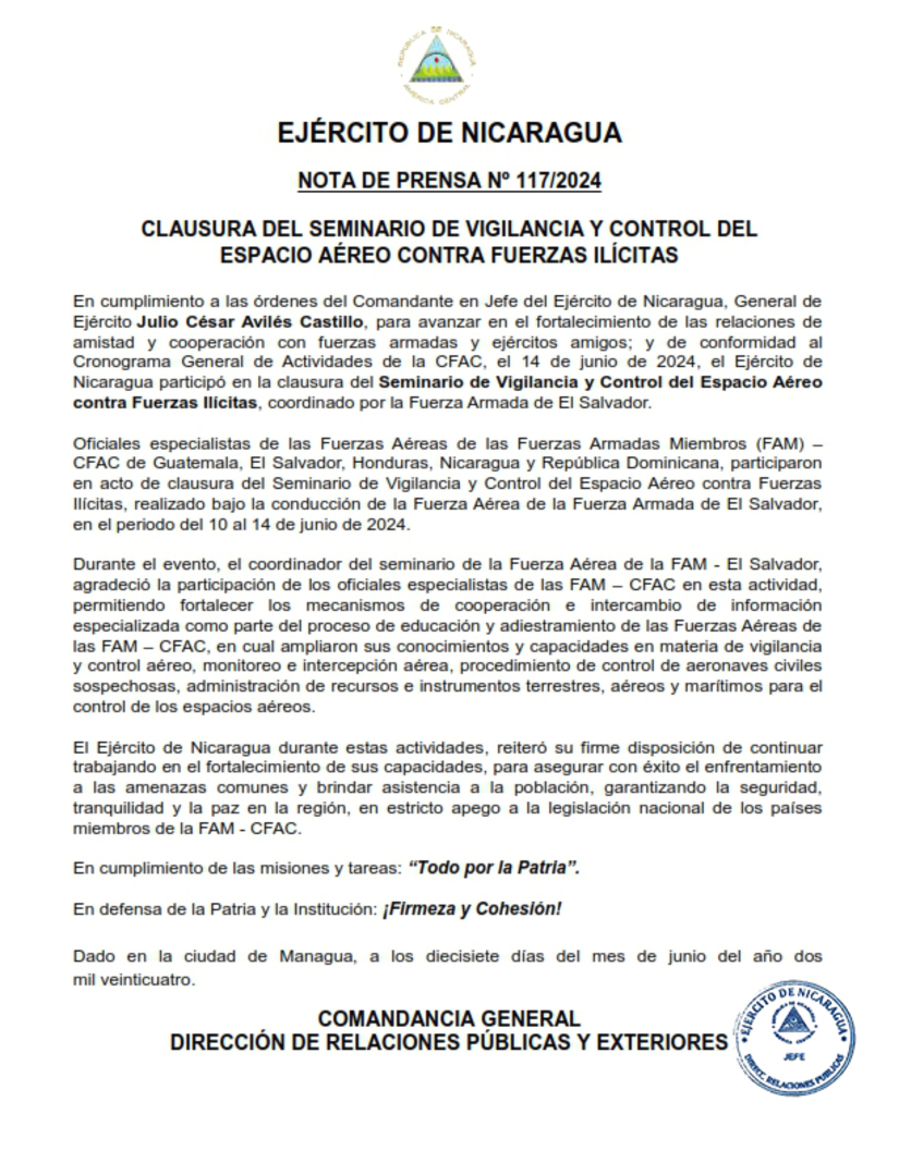 En cumplimiento a las órdenes del Comandante en Jefe del Ejército de Nicaragua, General de Ejército Julio César Avilés Castillo, para avanzar en el fortalecimiento de las relaciones de amistad y cooperación con fuerzas armadas y ejércitos amigos; y de conformidad al Cronograma General de Actividades de la CFAC, el 14 de junio de 2024, el Ejército de Nicaragua participó en la clausura del Seminario de Vigilancia y Control del Espacio Aéreo contra Fuerzas Ilícitas, coordinado por la Fuerza Armada de El Salvador.