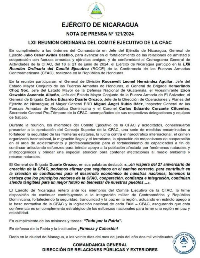 El Ejército de Nicaragua reiteró ante los miembros del Comité Ejecutivo de la CFAC, la firme disposición de continuar contribuyendo a la integración militar de Centroamérica y República Dominicana, fortaleciendo la seguridad, tranquilidad y la paz en la región, actuando en estricto apego a la base normativa de la CFAC y la legislación nacional de cada FAM CFAC, asegurando que esta conferencia es un complemento estratégico de los esfuerzos nacionales para tener una región en paz y estabilidad.