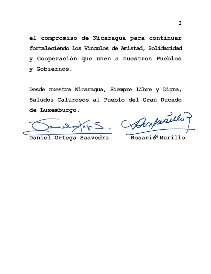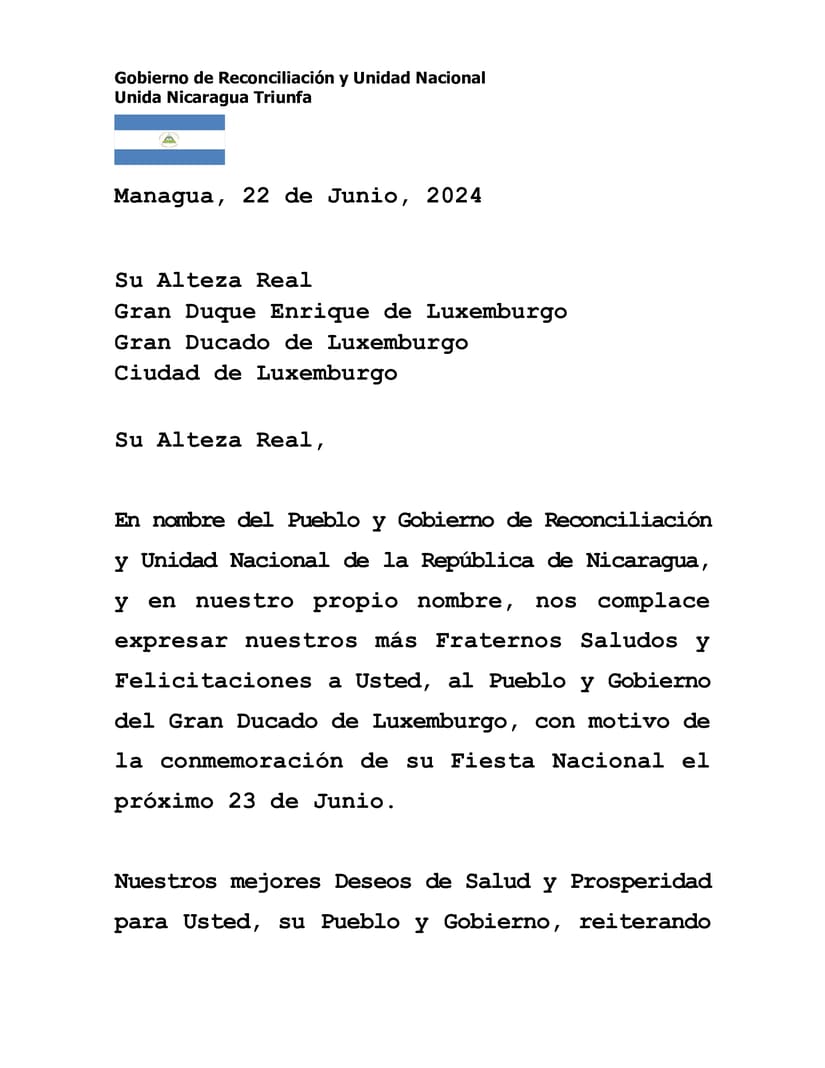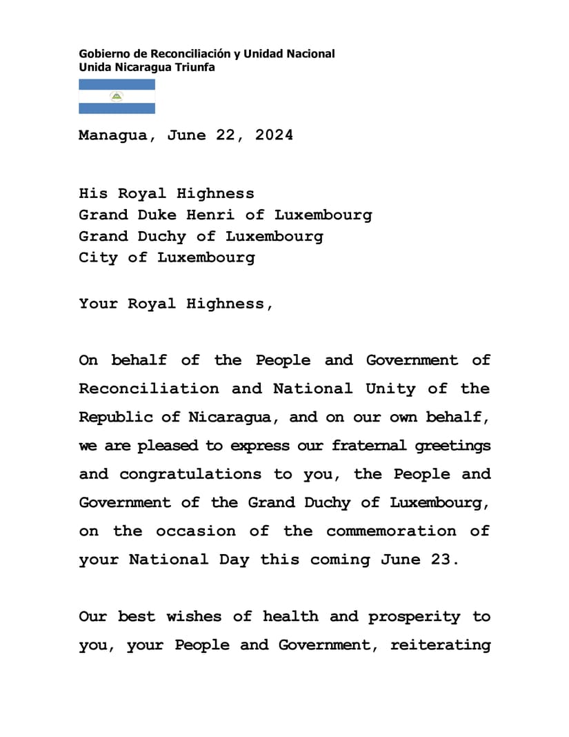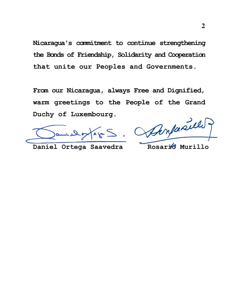 On behalf of the People and Government of Reconciliation and National Unity of the Republic of Nicaragua, and on our own behalf, we are pleased to express our fraternal greetings and congratulations to you, the People and Government of the Grand Duchy of Luxembourg, on the occasion of the commemoration of your National Day this coming June 23.