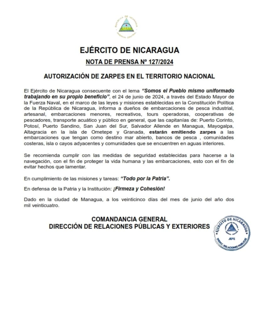 El Ejército de Nicaragua consecuente con el lema "Somos el Pueblo mismo uniformado trabajando en su propio beneficio", el 24 de junio de 2024, a través del Estado Mayor de la Fuerza Naval, en el marco de las leyes y misiones establecidas en la Constitución Politica de la República de Nicaragua, informa a dueños de embarcaciones de pesca industrial, artesanal, embarcaciones menores, recreativos, tours operadoras, cooperativas de pescadores, transporte acuático y público en general, que las capitanías de: Puerto Corinto, Potosí, Puerto Sandino, San Juan del Sur, Salvador Allende en Managua, Mayogalpa, Altagracia en la isla de Ometepe y Granada, estarán emitiendo zarpes a las embarcaciones que tengan como destino mar abierto, bancos de pesca, comunidades costeras, isla o cayos adyacentes y comunidades que se encuentren en aguas interiores.