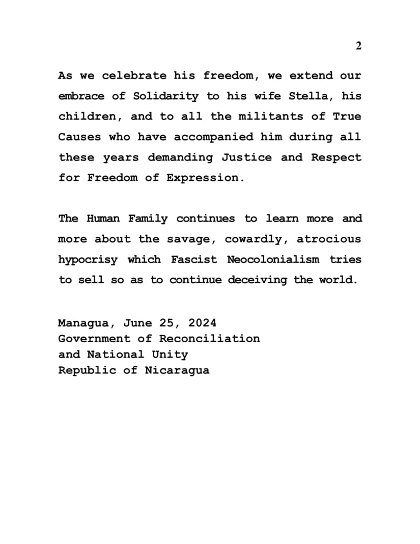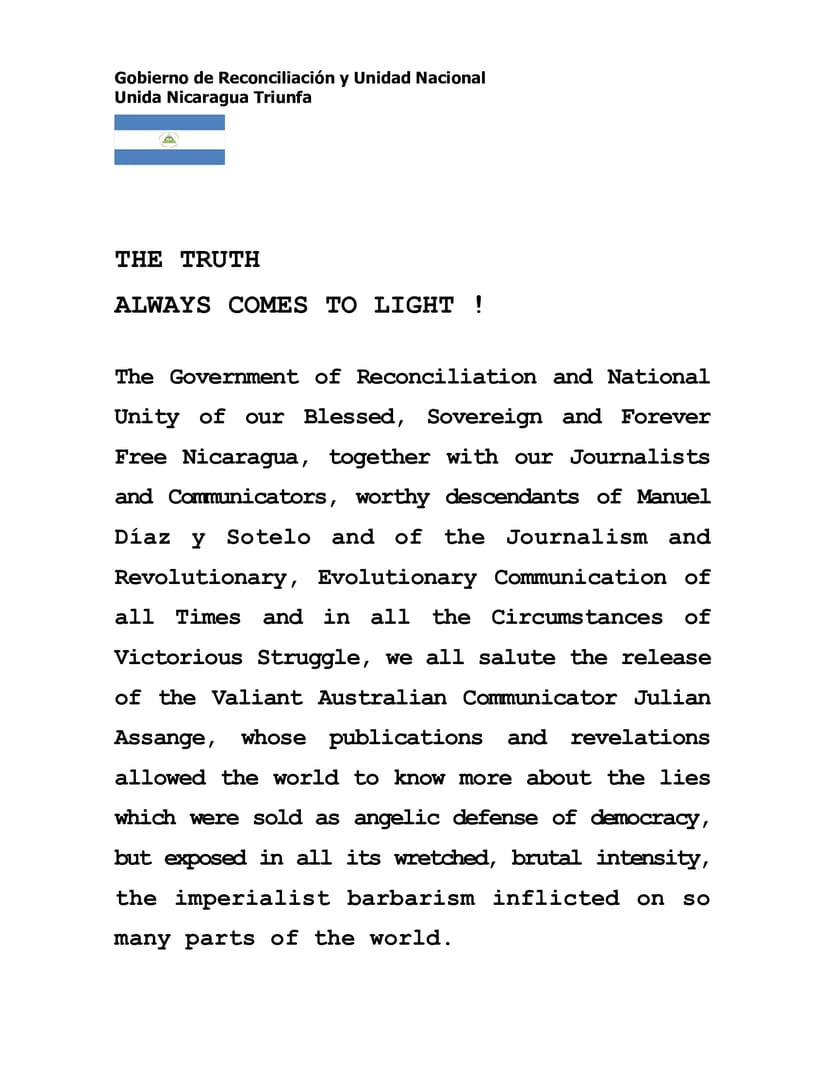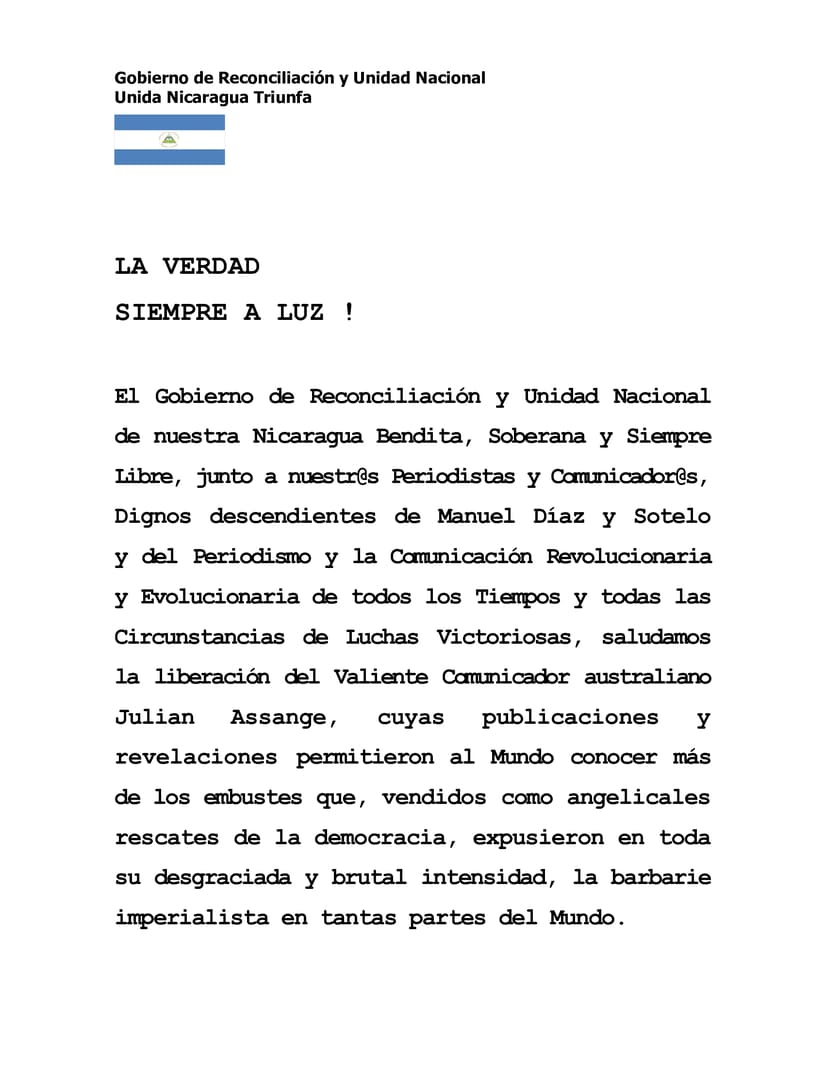 The Government of Reconciliation and National Unity of our Blessed, Sovereign and Forever Free Nicaragua, together with our Journalists and Communicators, worthy descendants of Manuel Díaz y Sotelo and of the Journalism and Revolutionary, Evolutionary Communication of all Times and in all the Circumstances of Victorious Struggle, we all salute the release of the Valiant Australian Communicator Julian Assange, whose publications and revelations allowed the world to know more about the lies which were sold as angelic defense of democracy, but exposed in all its wretched, brutal intensity, the imperialist barbarism inflicted on so many parts of the world.