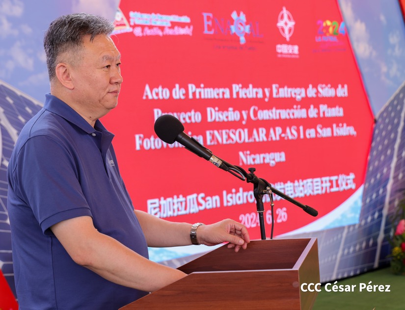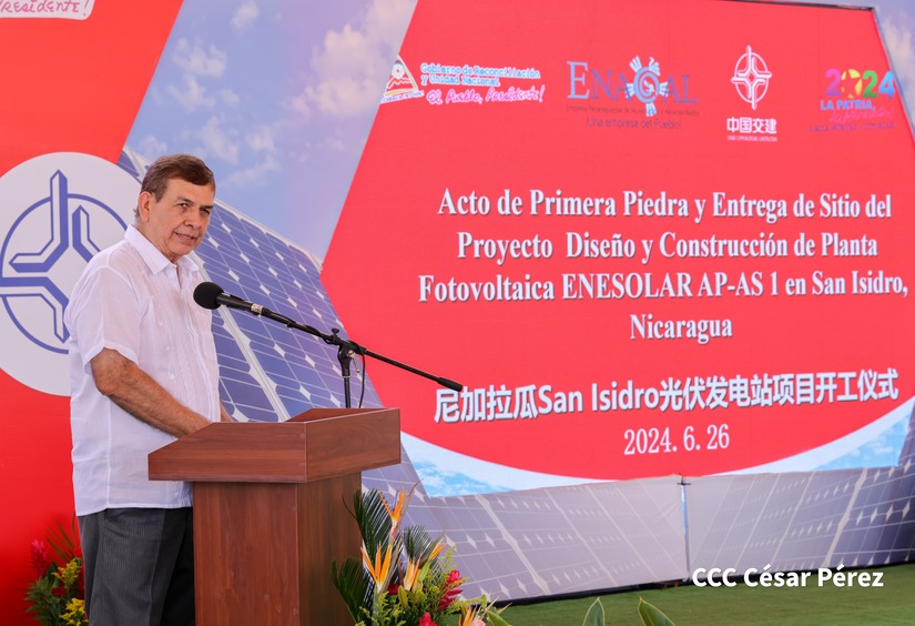 "Ya hemos anunciado que pronto estaremos iniciando la construcción del nuevo Aeropuerto Panchito. Estamos trabajando proyectos de infraestructura vial, proyectos de salud, proyectos de agua y saneamiento, proyectos para un plan de transformación digital en nuestro país, proyectos de infraestructura en todos los campos, proyectos de apoyo a la producción, de fomento a las exportaciones, de fortalecimiento a las capacidades logísticas de nuestro país y para hacer todo esto hay algo fundamental, necesitamos energía, necesitamos garantizar el suministro de energía y una energía sostenible, renovable, que nos permita como país sostenibilidad, desarrollo responsable y hemos recibido a esta gran empresa CCCC, que ha venido trabajando con nuestros ministerios identificando proyectos y se seleccionó este proyecto, la planta solar en San Isidro como el primer proyecto para su desarrollo, implementación bajo el modelo de créditos de China para Nicaragua", afirmó el compañero Laureano.