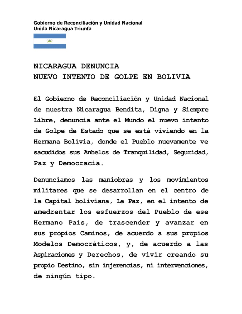 Y agregó que “desde nuestra Nicaragua, que ha trascendido una historia de agresiones e intervenciones foráneas, nuestra solidaridad clara y definida con ese pueblo hermano, con su Presidente Compañero Luis Arce, con su Vicepresidente, el Compañero David Choquehuanca y con el hermano Evo Morales, expresidente y dirigente social y popular de ese gran pueblo, fuerza hermanos bolivianos. Este nuevo intento de Golpe de Estado no pasará, siempre más allá. Y suscribimos esta comunicación, el Comandante Daniel nuestro Presidente, mi persona y las familias de esta Nicaragua bendecida, siempre digna, siempre libre y sobre todo siempre fraternal y solidaria con los pueblos, libres, valientes y dignos también del mundo entero”, destacó la Vicepresidenta de la República.
