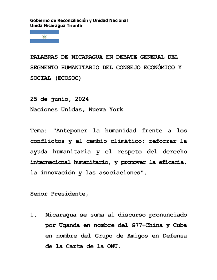 En nombre de nuestro Gobierno de Reconciliación y Unidad Nacional, participó la Compañera Eleane Pichardo Urbina, Embajadora, Representante Permanente Alterna de Nicaragua, resaltando la necesidad de reforzar el multilateralismo y la solidaridad, así como la búsqueda permanente de la Paz y el humanismo, como principios rectores para sobreponernos a los grandes retos que enfrenta hoy en día la humanidad.