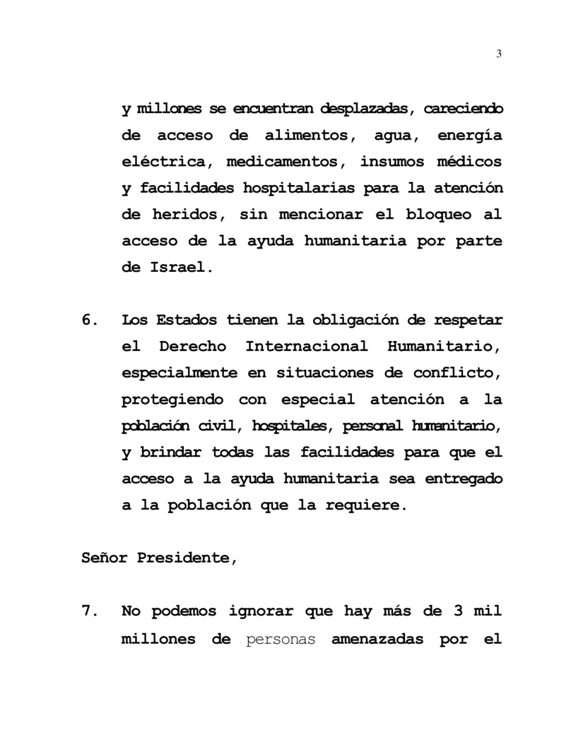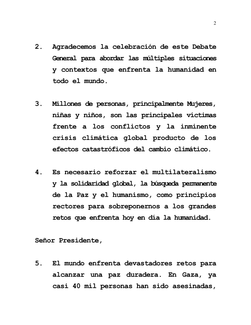 También, la Compañera Embajadora, dentro de los retos que enfrenta nuestro mundo, indicó la devastadora situación en Gaza, donde ya casi 40 mil personas han sido asesinadas, y millones desplazadas, careciendo de las necesidades humanas más básicas, entre estos, alimentos, agua, energía eléctrica, medicinas, insumos médicos para los heridos, y el bloqueo de la asistencia humanitaria por parte de Israel.