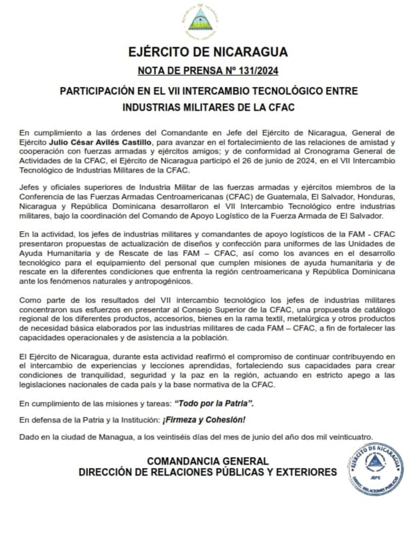 En cumplimiento a las órdenes del Comandante en Jefe del Ejército de Nicaragua, General de Ejército Julio César Avilés Castillo, para avanzar en el fortalecimiento de las relaciones de amistad y cooperación con fuerzas armadas y ejércitos amigos; y de conformidad al Cronograma General de Actividades de la CFAC, el Ejército de Nicaragua participó el 26 de junio de 2024, en el VII Intercambio Tecnológico de Industrias Militares de la CFAC.