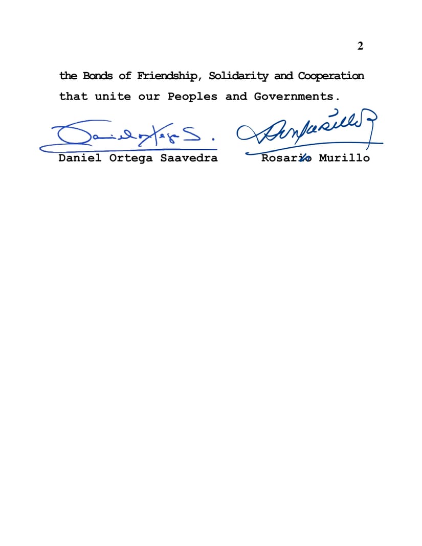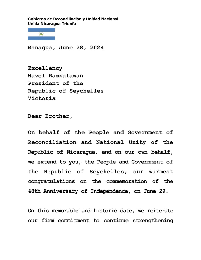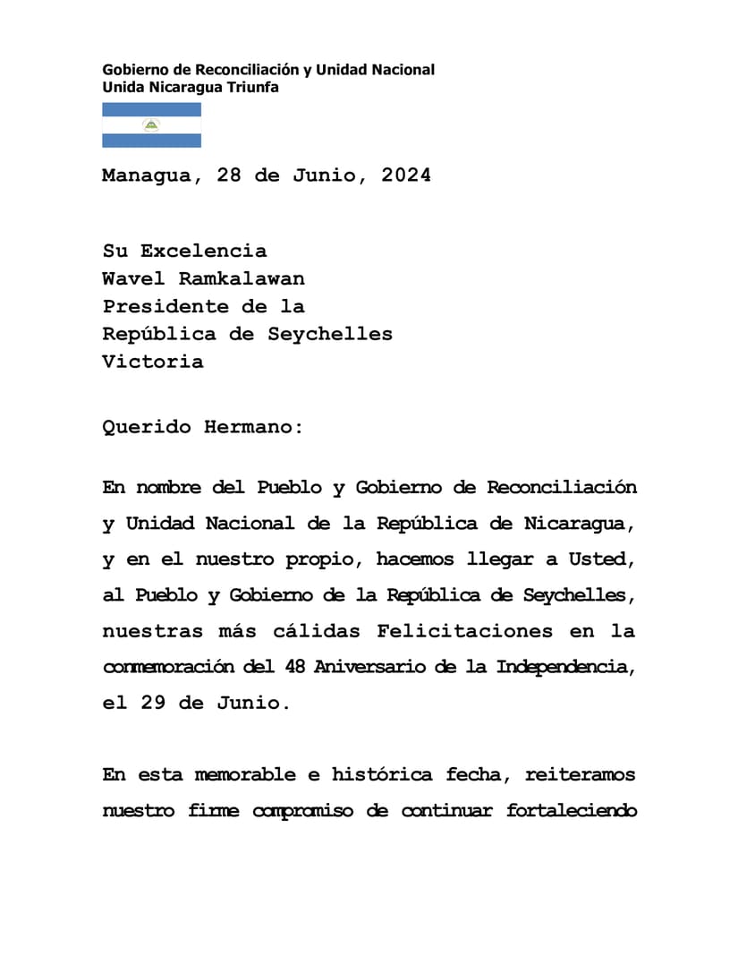 En nombre del Pueblo y Gobierno de Reconciliación y Unidad Nacional de la República de Nicaragua, y en el nuestro propio, hacemos llegar a Usted, al Pueblo y Gobierno de la República de Seychelles, nuestras más cálidas Felicitaciones en la conmemoración del 48 Aniversario de la Independencia, el 29 de Junio.