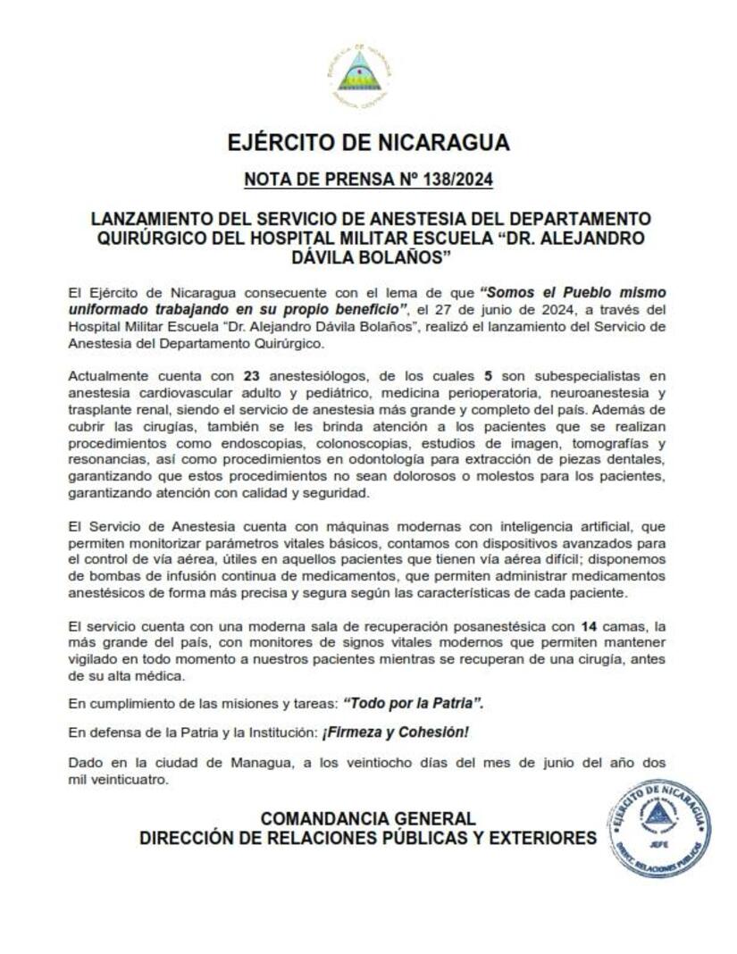 El Ejército de Nicaragua consecuente con el lema de que "Somos el Pueblo mismo uniformado trabajando en su propio beneficio", el 27 de junio de 2024, a través del Hospital Militar Escuela "Dr. Alejandro Dávila Bolaños", realizó el lanzamiento del Servicio de Anestesia del Departamento Quirúrgico.