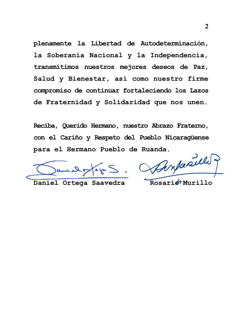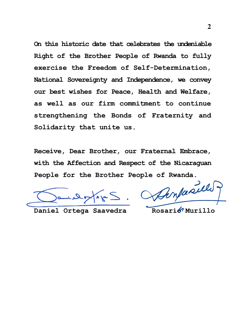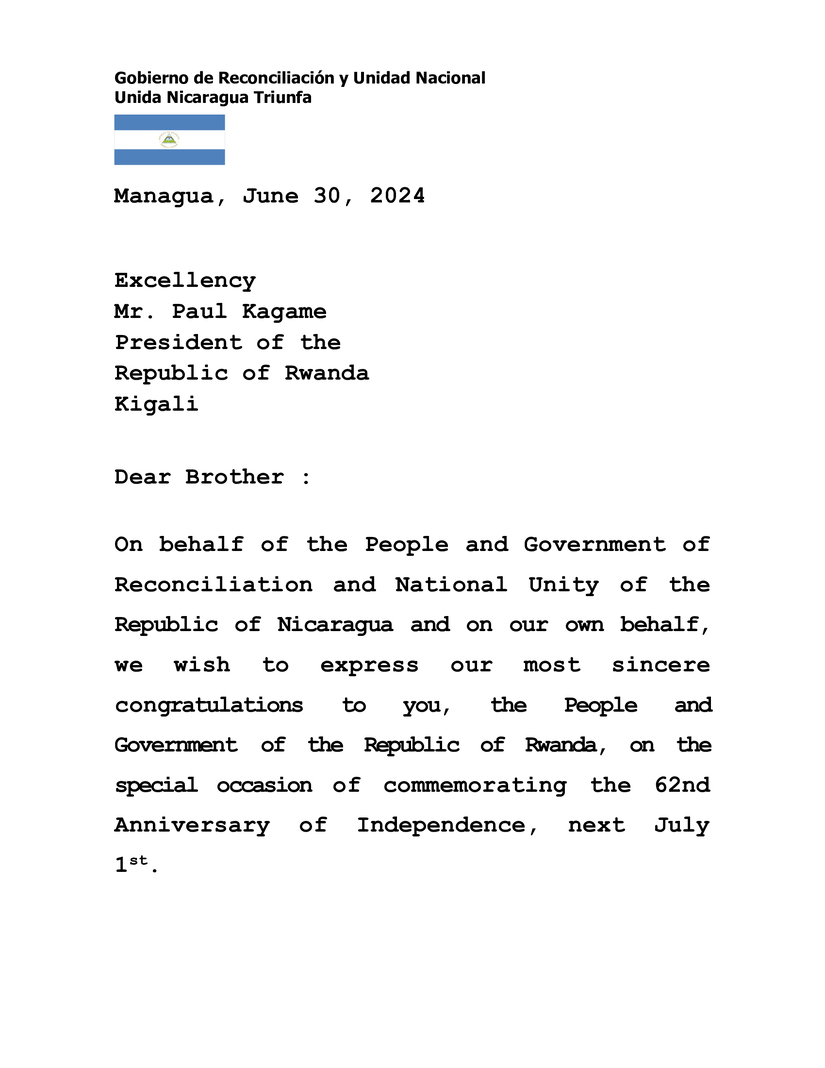 En nombre del Pueblo y Gobierno de Reconciliación y Unidad Nacional de la República de Nicaragua y en nuestro propio nombre, deseamos expresar nuestras más sinceras felicitaciones a Usted, al Pueblo y Gobierno de la República de Ruanda, en la ocasión especial de conmemorar el 62 Aniversario de la Independencia, el próximo 1 de Julio.