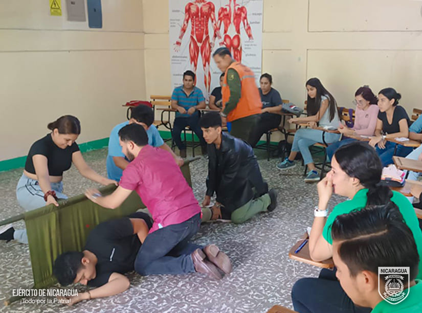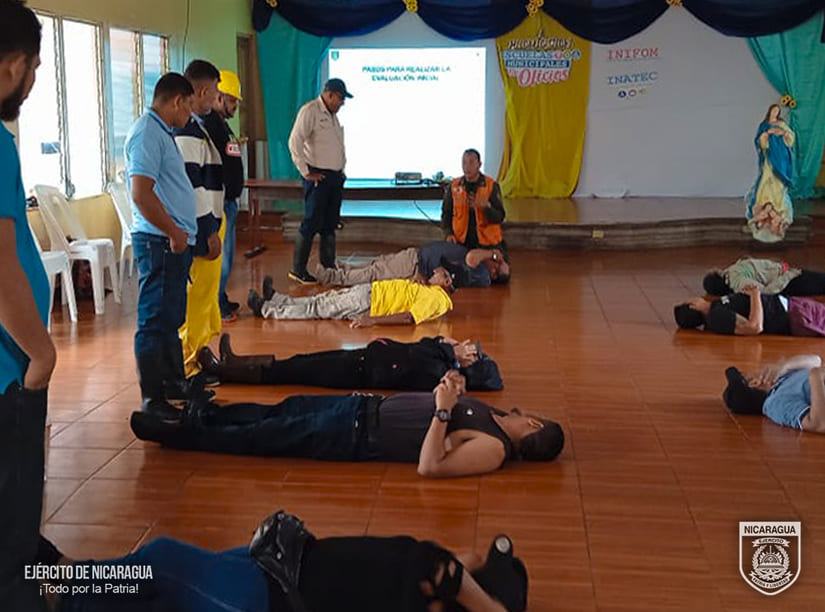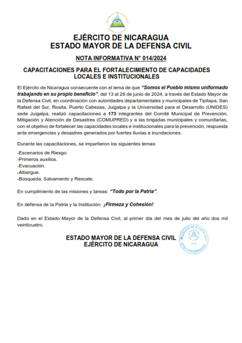 El Ejército de Nicaragua consecuente con el lema de que “Somos el Pueblo mismo uniformado trabajando en su propio beneficio”, del 13 al 26 de junio de 2024, a través del Estado Mayor de la Defensa Civil, en coordinación con autoridades departamentales y municipales de Tipitapa, San Rafael del Sur, Rosita, Puerto Cabezas, Juigalpa y la Universidad para el Desarrollo (UNIDES) sede Juigalpa, realizó capacitaciones a 173 integrantes del Comité Municipal de Prevención, Mitigación y Atención de Desastres (COMUPRED) y a las brigadas municipales y comunitarias, con el objetivo de fortalecer las capacidades locales e institucionales para la prevención, respuesta ante emergencias y desastres generados por fuertes lluvias e inundaciones.