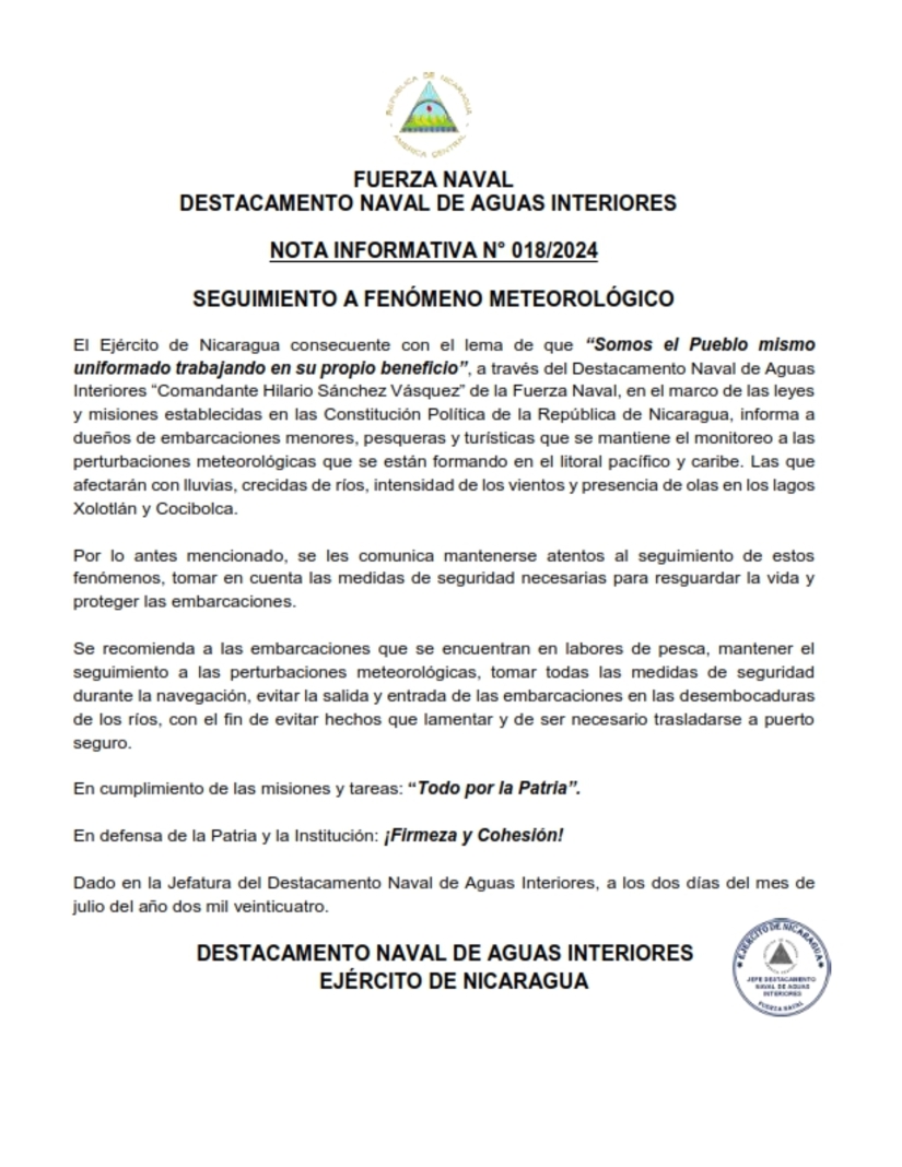 El Ejército de Nicaragua consecuente con el lema de que “Somos el Pueblo mismo uniformado trabajando en su propio beneficio”, a través del Destacamento Naval de Aguas Interiores “Comandante Hilario Sánchez Vásquez” de la Fuerza Naval, en el marco de las leyes y misiones establecidas en las Constitución Política de la República de Nicaragua, informa a dueños de embarcaciones menores, pesqueras y turísticas que se mantiene el monitoreo a las perturbaciones meteorológicas que se están formando en el litoral pacífico y caribe. Las que afectarán con lluvias, crecidas de ríos, intensidad de los vientos y presencia de olas en los lagos Xolotlán y Cocibolca.