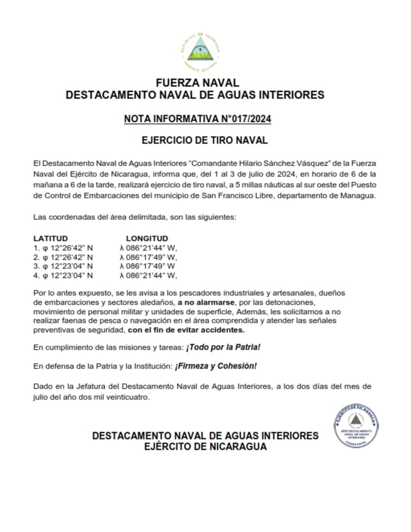 El Destacamento Naval de Aguas Interiores “Comandante Hilario Sánchez Vásquez” de la Fuerza Naval del Ejército de Nicaragua, informa que, del 1 al 3 de julio de 2024, en horario de 6 de la mañana a 6 de la tarde, realizará ejercicio de tiro naval, a 5 millas náuticas al sur oeste del Puesto de Control de Embarcaciones del municipio de San Francisco Libre, departamento de Managua.