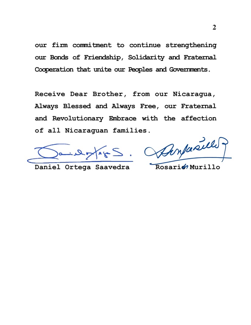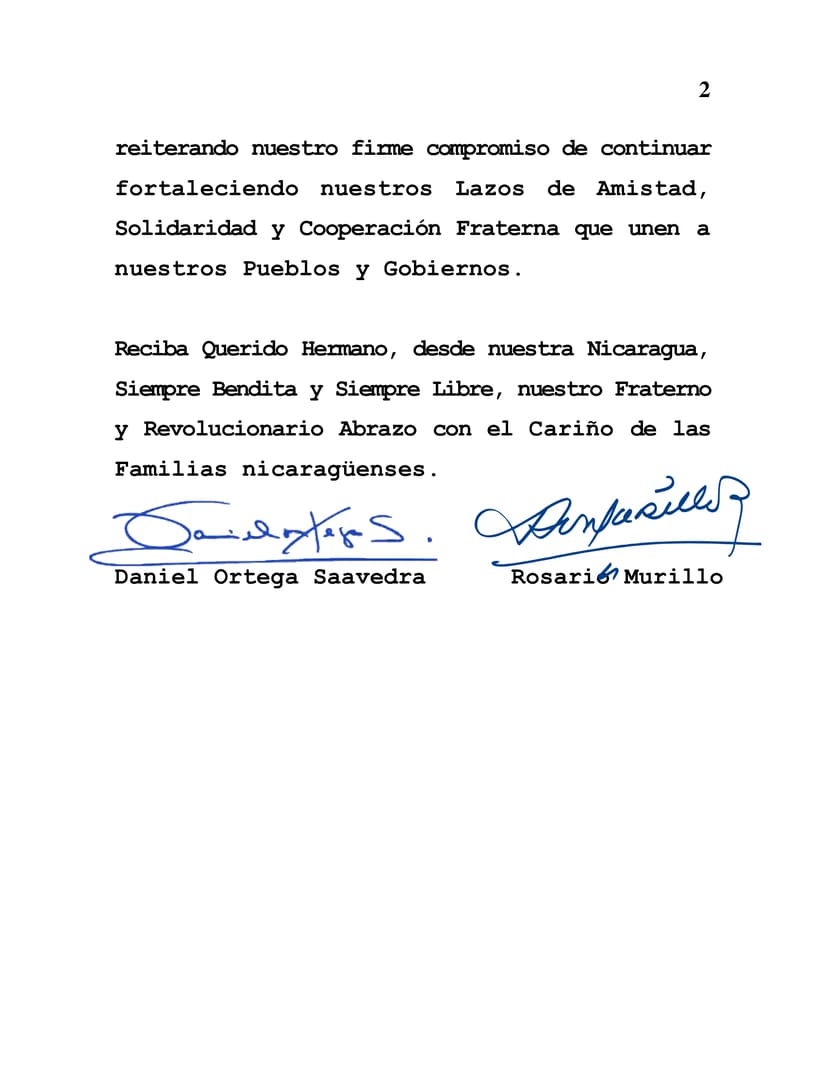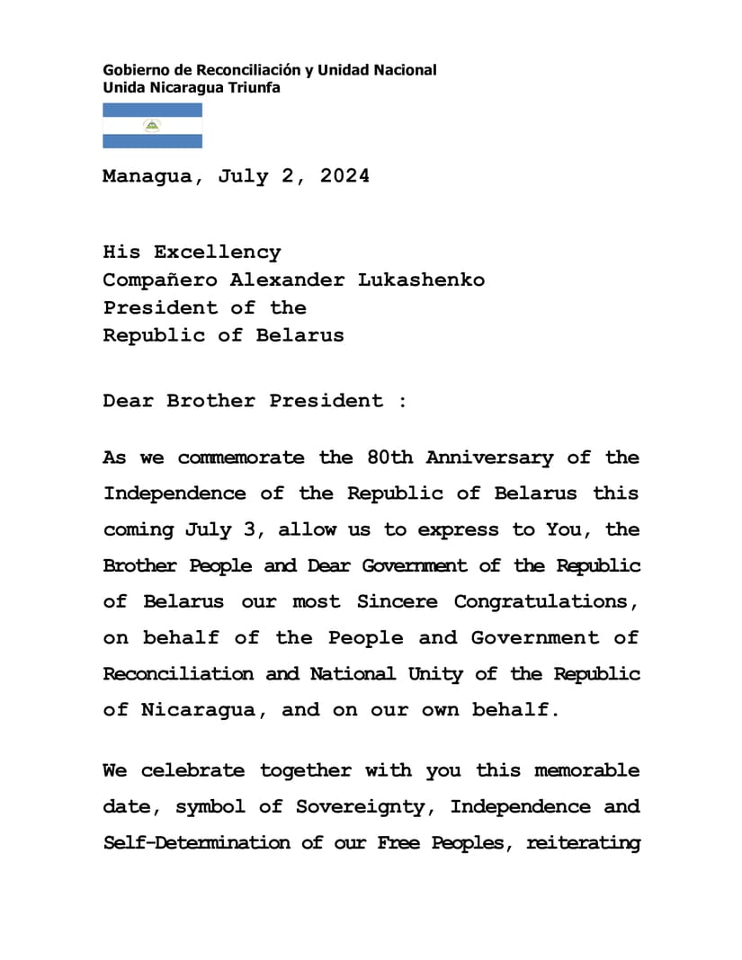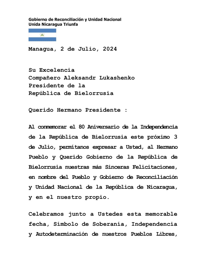 Al conmemorar el 80 Aniversario de la Independencia de la República de Bielorrusia este próximo 3 de Julio, permítanos expresar a Usted, al Hermano Pueblo y Querido Gobierno de la República de Bielorrusia nuestras más Sinceras Felicitaciones, en nombre del Pueblo y Gobierno de Reconciliación y Unidad Nacional de la República de Nicaragua, y en el nuestro propio.