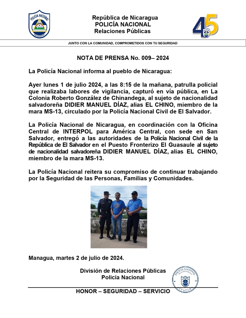La Policía Nacional de Nicaragua, en coordinación con la Oficina Central de INTERPOL para América Central, con sede en San Salvador, entregó a las autoridades de la Policía Nacional Civil de la República de El Salvador en el Puesto Fronterizo El Guasaule al sujeto de nacionalidad salvadoreña DIDIER MANUEL DÍAZ, alias EL CHINO, miembro de la mara MS-13.
