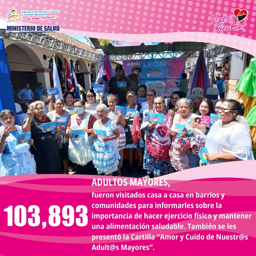 • 103,893 Adult@s Mayores visitados en sus casas en barrios y comunidades para informarles sobre la importancia de hacer ejercicio físico y mantener una alimentación saludable; además, se les presentó la Cartilla “Amor y Cuido de Nuestr@s Adult@s Mayores”.