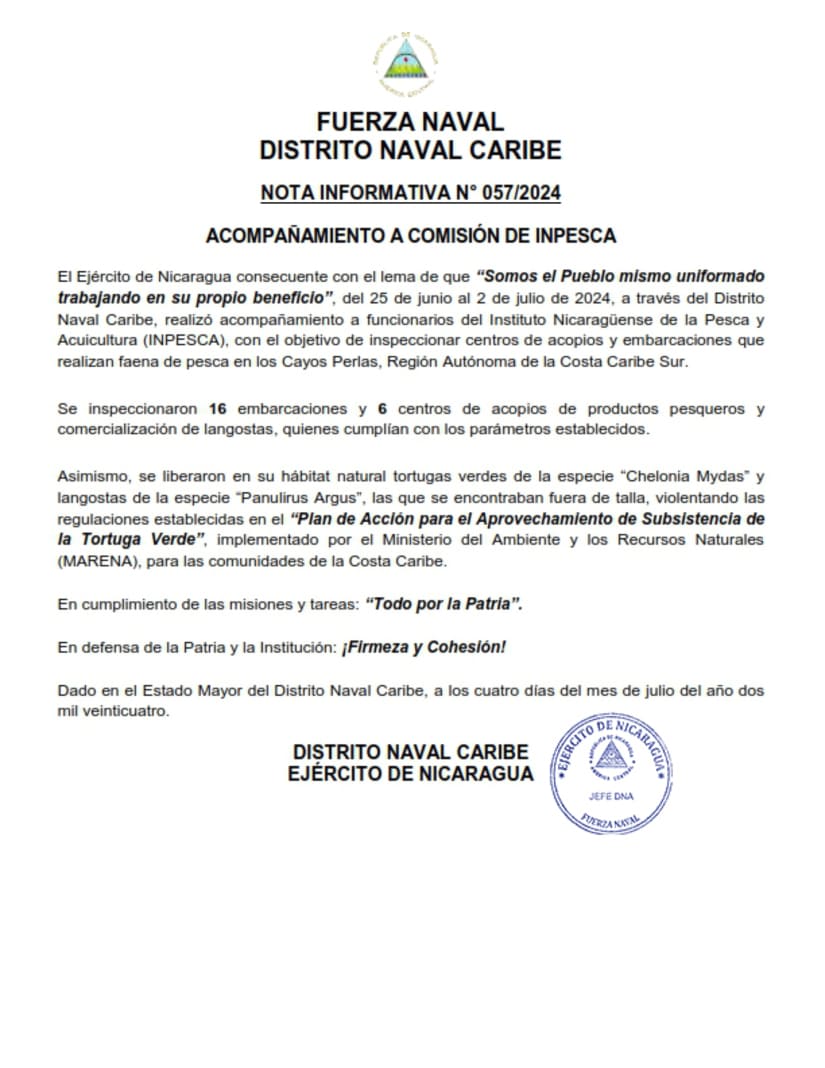 El Ejército de Nicaragua consecuente con el lema de que “Somos el Pueblo mismo uniformado trabajando en su propio beneficio”, del 25 de junio al 2 de julio de 2024, a través del Distrito Naval Caribe, realizó acompañamiento a funcionarios del Instituto Nicaragüense de la Pesca y Acuicultura (INPESCA), con el objetivo de inspeccionar centros de acopios y embarcaciones que realizan faena de pesca en los Cayos Perlas, Región Autónoma de la Costa Caribe Sur.