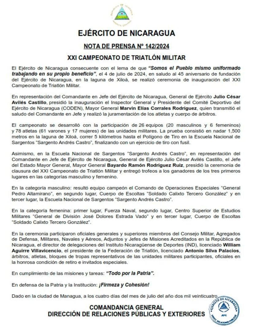El Ejército de Nicaragua consecuente con el lema de que “Somos el Pueblo mismo uniformado trabajando en su propio beneficio”, el 4 de julio de 2024, en saludo al 45 aniversario de fundación del Ejército de Nicaragua, en la laguna de Xiloá, se realizó ceremonia de inauguración del XXI Campeonato de Triatlón Militar.