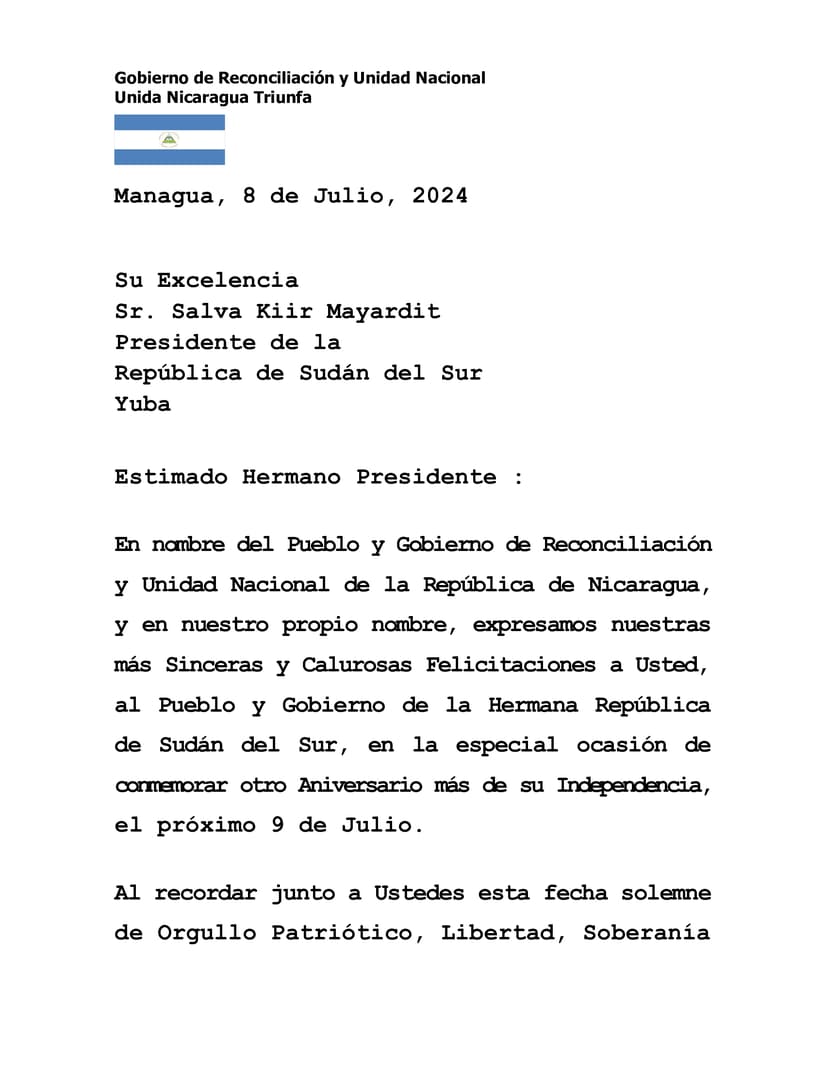 En nombre del Pueblo y Gobierno de Reconciliación y Unidad Nacional de la República de Nicaragua, y en nuestro propio nombre, expresamos nuestras más Sinceras y Calurosas Felicitaciones a Usted, al Pueblo y Gobierno de la Hermana República de Sudán del Sur, en la especial ocasión de conmemorar otro Aniversario más de su Independencia, el próximo 9 de Julio.