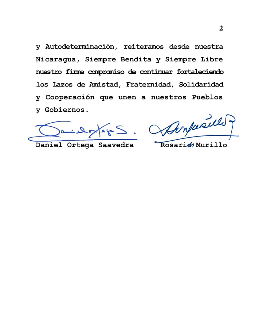 Al recordar junto a Ustedes esta fecha solemne de Orgullo Patriótico, Libertad, Soberanía y Autodeterminación, reiteramos desde nuestra Nicaragua, Siempre Bendita y Siempre Libre nuestro firme compromiso de continuar fortaleciendo los Lazos de Amistad, Fraternidad, Solidaridad y Cooperación que unen a nuestros Pueblos y Gobiernos.