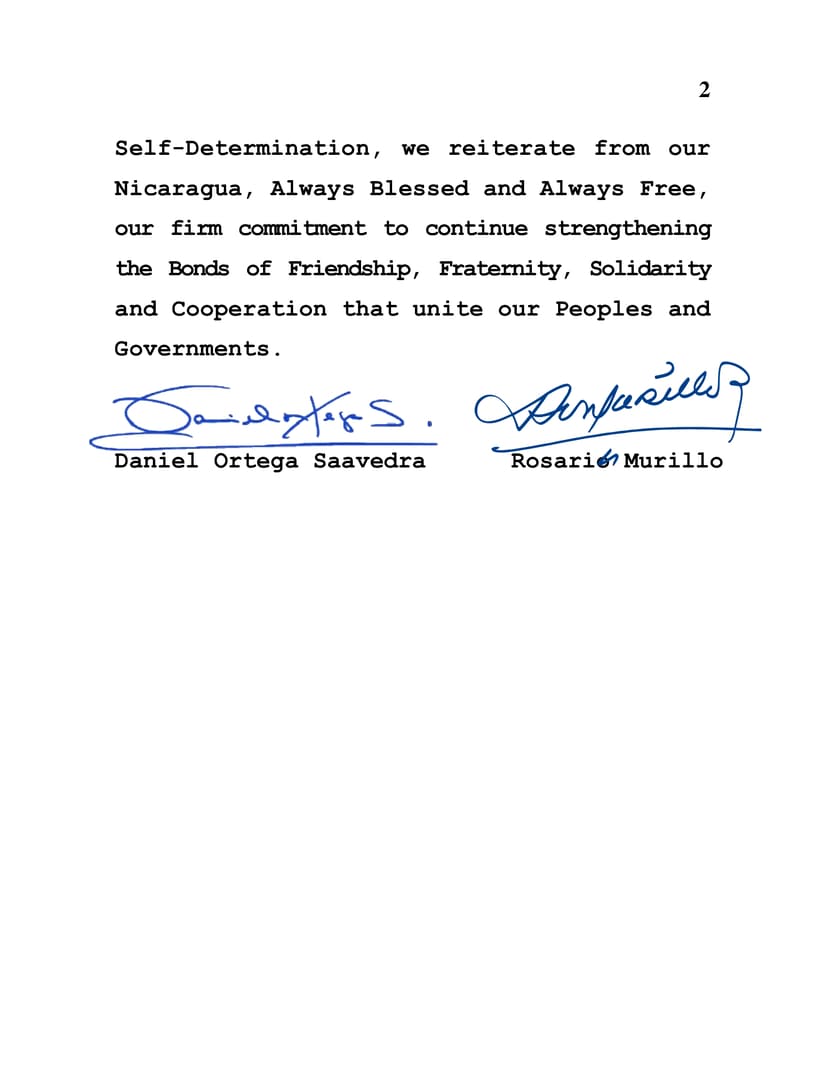 As we commemorate with you this solemn date of Patriotic Pride, Freedom, Sovereignty and Self-Determination, we reiterate from our Nicaragua, Always Blessed and Always Free, our firm commitment to continue strengthening the Bonds of Friendship, Fraternity, Solidarity and Cooperation that unite our Peoples and Governments.