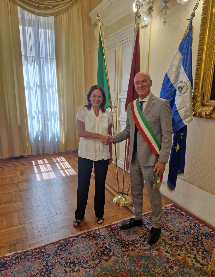 En este marco, la Compañera Mónica Robelo, Embajadora en Italia, sostuvo un encuentro en el Palacio Municipal con el Señor Luca Salvetti, Alcalde de la Ciudad de Livorno, y con el Señor Simone Lenzi, Asesor para la Cultura, con el propósito de vigorizar la Cooperación con esta importante Ciudad.