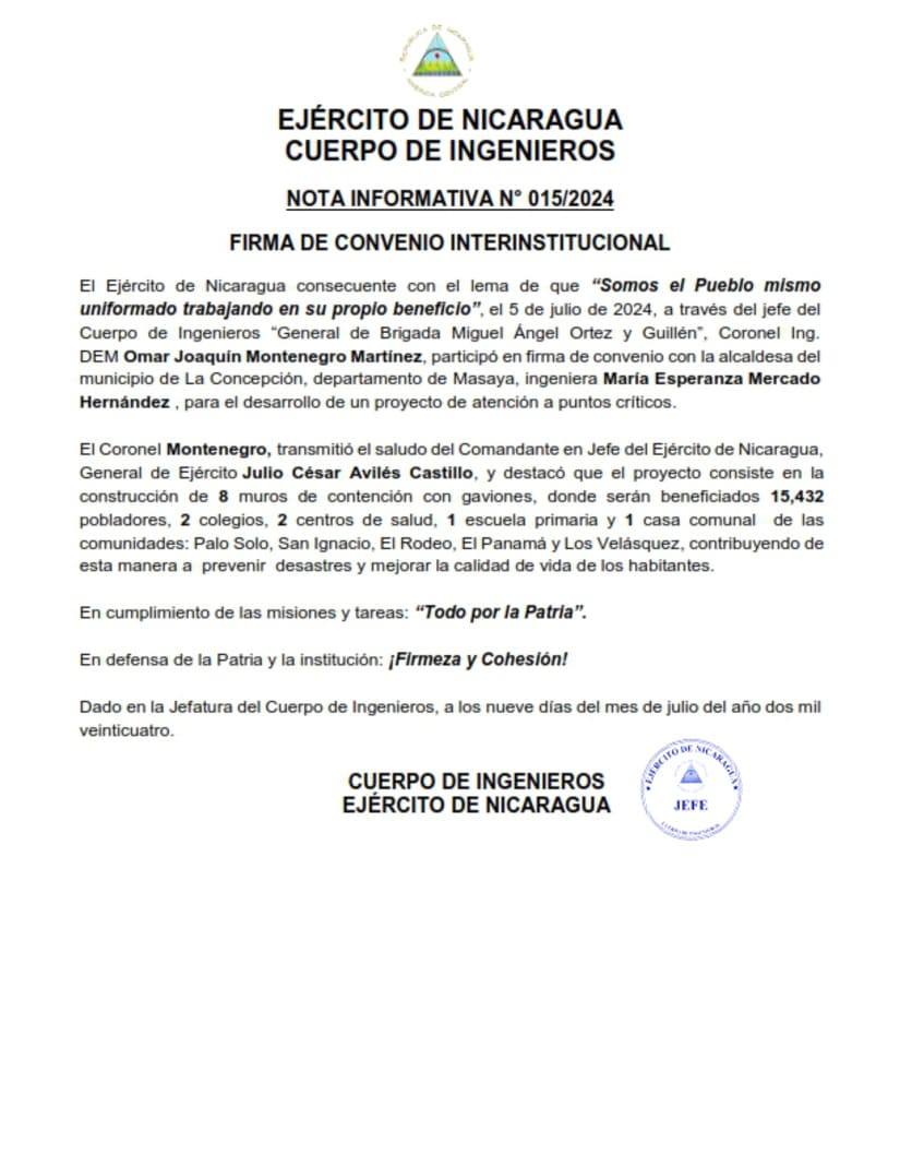 El Ejército de Nicaragua consecuente con el lema de que “Somos el Pueblo mismo uniformado trabajando en su propio beneficio”, el 5 de julio de 2024, a través del jefe del Cuerpo de Ingenieros “General de Brigada Miguel Ángel Ortez y Guillén”, Coronel Ing. DEM Omar Joaquín Montenegro Martínez, participó en firma de convenio con la alcaldesa del municipio de La Concepción, departamento de Masaya, ingeniera María Esperanza Mercado Hernández , para el desarrollo de un proyecto de atención a puntos críticos.