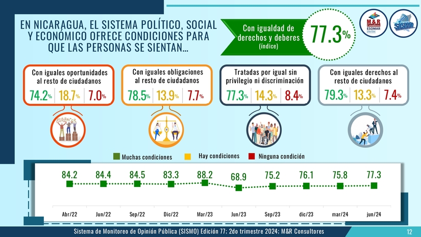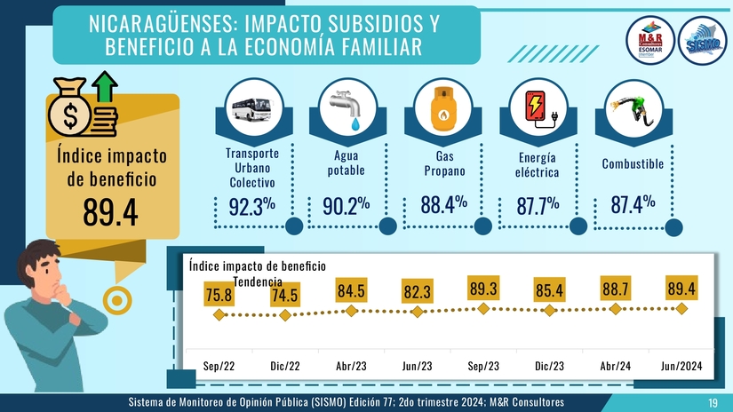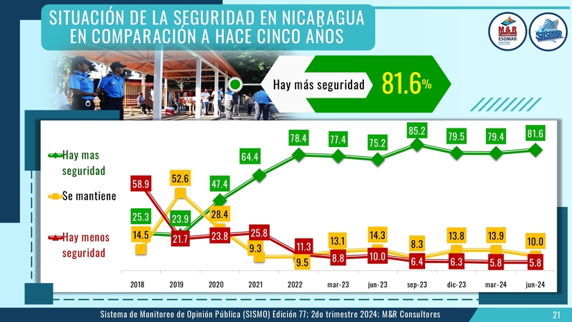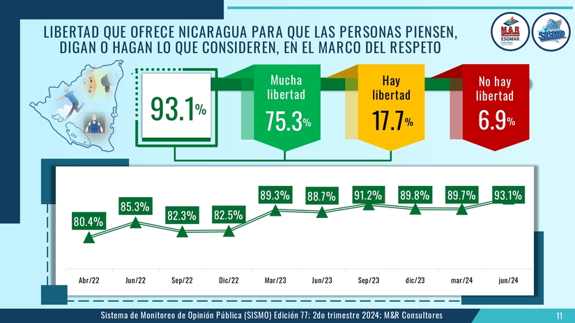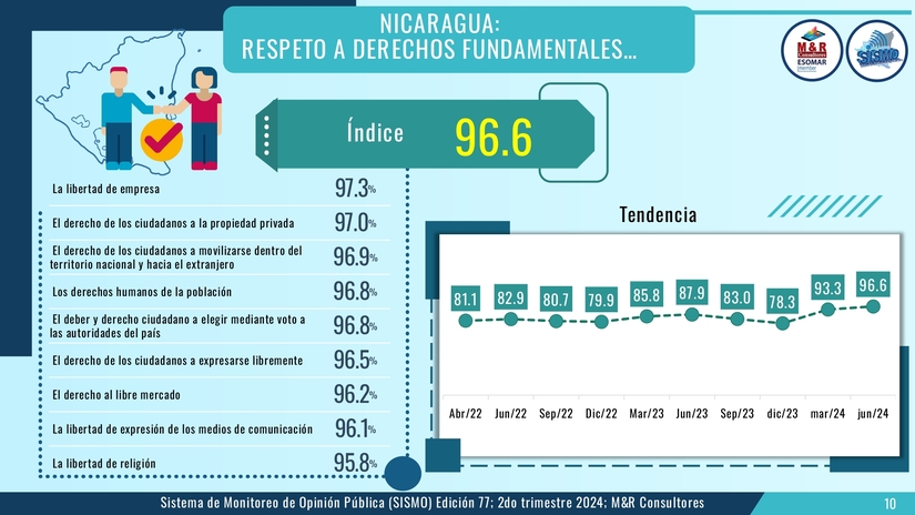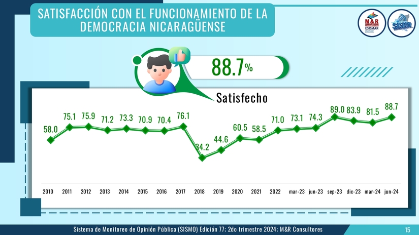 Un 82.4 aprueba la gestión del gobierno, un 91.8 por ciento considera que el Gobierno Sandinista genera esperanza, el 89 por ciento está satisfecho con la actual Nicaragua y un 89.9 está satisfecho personalmente con su vida.