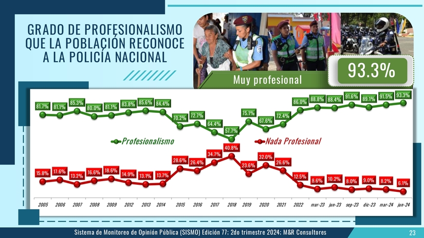 En este monitoreo de opinión, se consultó sobre el nivel de profesionalidad de la Policía Nacional y un 93.3 por ciento percibe que esta entidad es profesional y