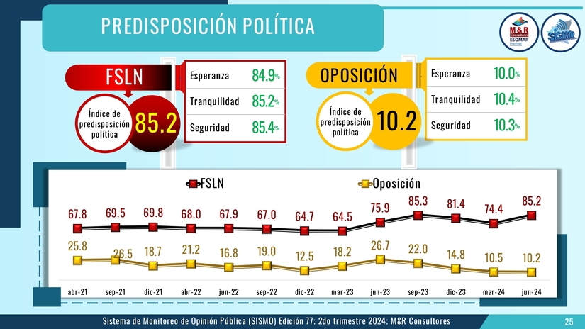 Este estudio reveló que el 85.2 de la población tiene predisposición política a favor del FSLN, mientras la oposición alcanza un 10.2 por ciento de opinión favorable.