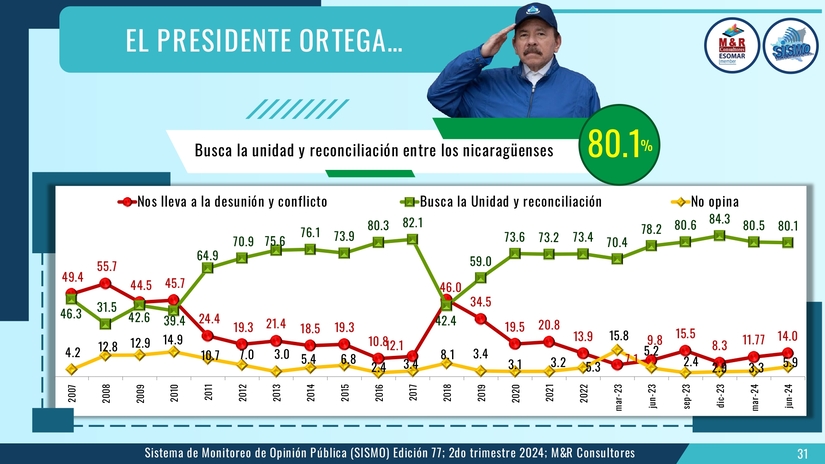 La población aprueba en 81.8 por ciento el estilo de gestión del Presidente Comandante Daniel, el 80.1 por ciento considera que el dirigente Sandinista busca y promueve la Unidad y reconciliación de los nicaragüenses, el 83 por ciento considera que el Presidente Daniel en rumba al país en la dirección correcta.