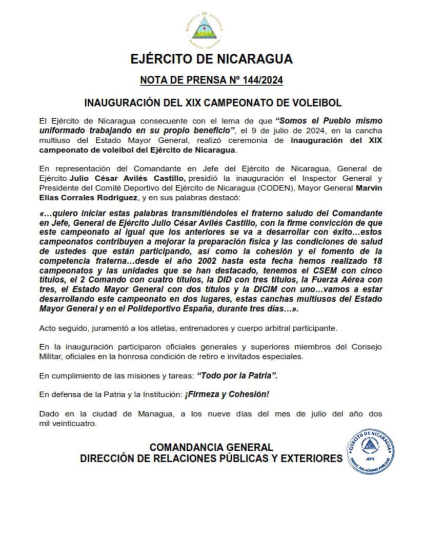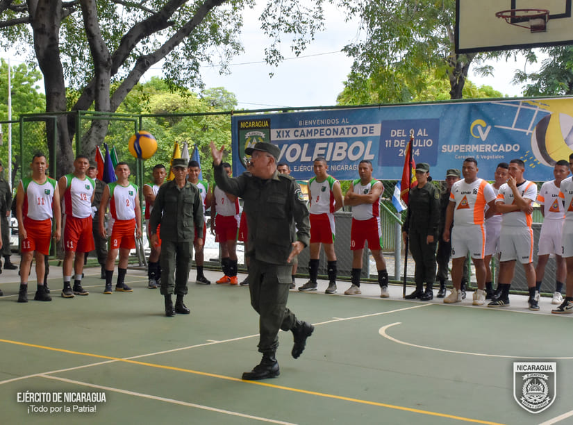 El Ejército de Nicaragua consecuente con el lema de que “Somos el Pueblo mismo uniformado trabajando en su propio beneficio”, el 9 de julio de 2024, en la cancha multiuso del Estado Mayor General, realizó ceremonia de inauguración del XIX campeonato de voleibol del Ejército de Nicaragua.
