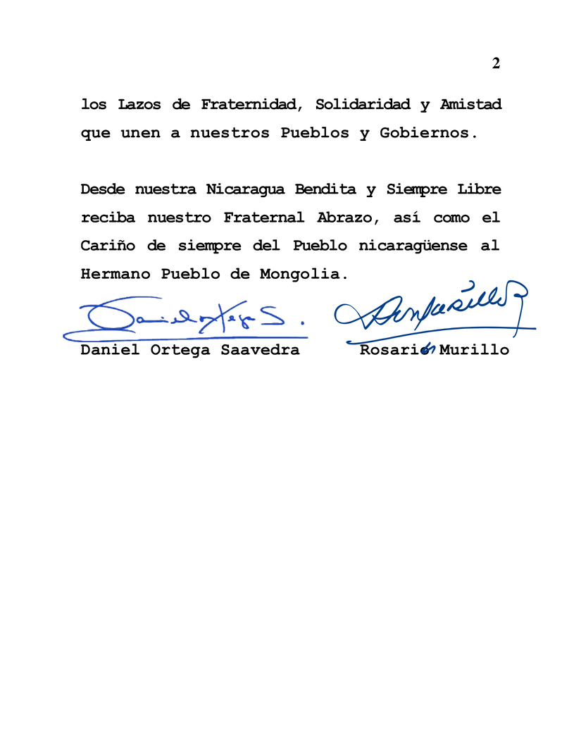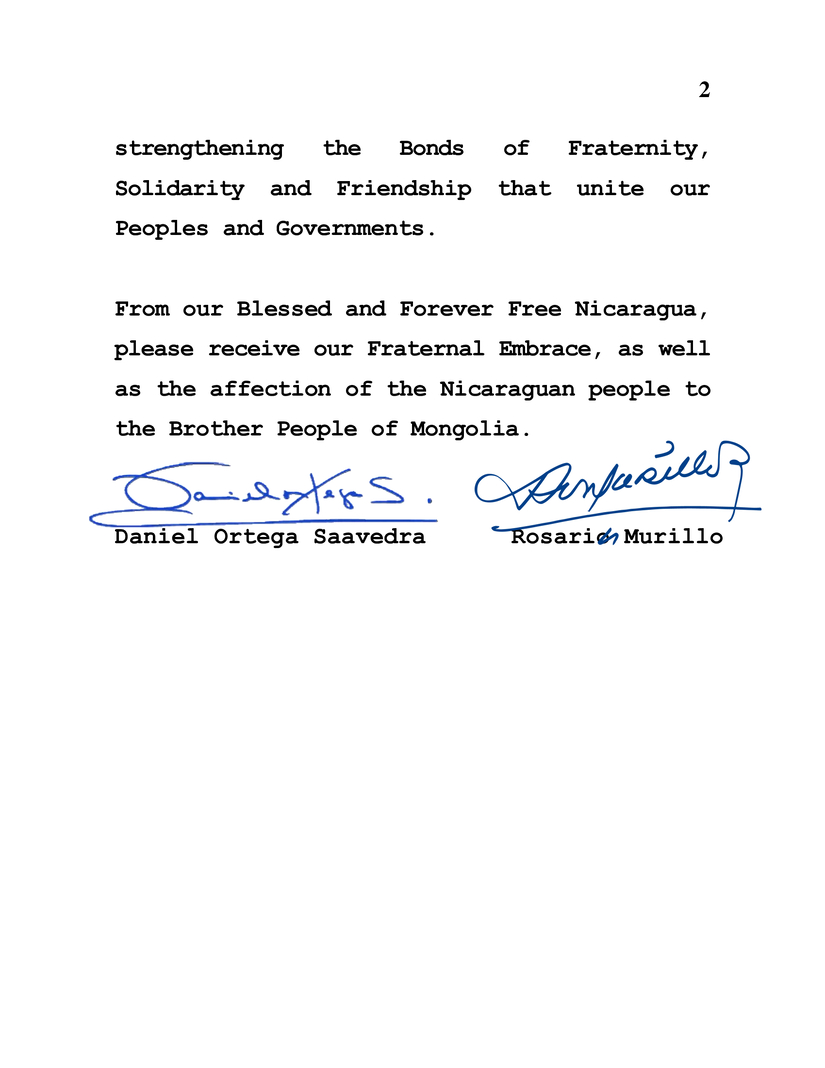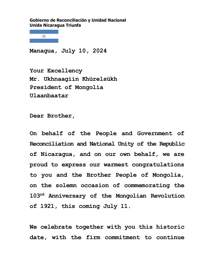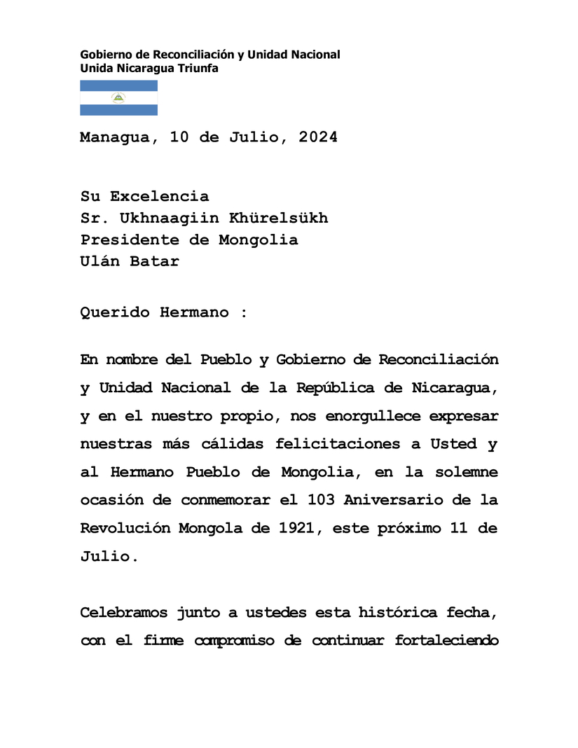 En nombre del Pueblo y Gobierno de Reconciliación y Unidad Nacional de la República de Nicaragua, y en el nuestro propio, nos enorgullece expresar nuestras más cálidas felicitaciones a Usted y al Hermano Pueblo de Mongolia, en la solemne ocasión de conmemorar el 103 Aniversario de la Revolución Mongola de 1921, este próximo 11 de Julio.