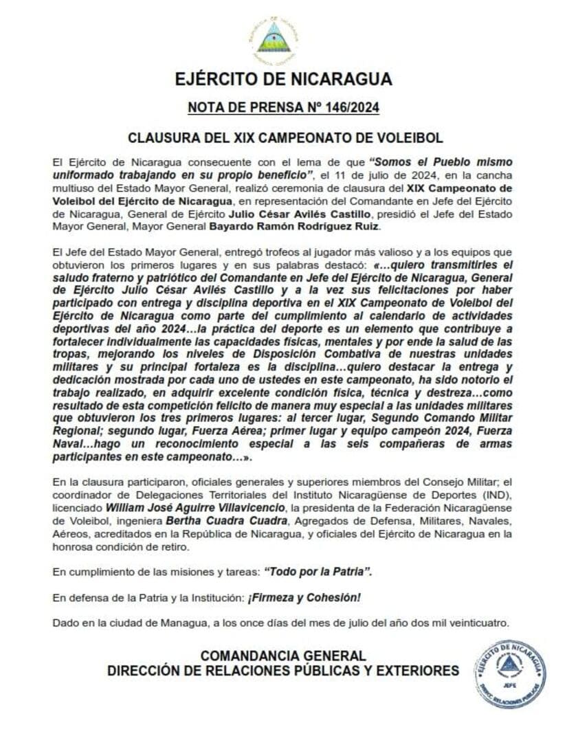 El 11 de julio de 2024, en la cancha multiuso del Estado Mayor General, se realizó ceremonia de clausura del XIX Campeonato de Voleibol del Ejército de Nicaragua, en representación del Comandante en Jefe del Ejército de Nicaragua, General de Ejército Julio César Avilés Castillo, presidió el Jefe del Estado Mayor General, Mayor General Bayardo Ramón Rodríguez Ruiz.
