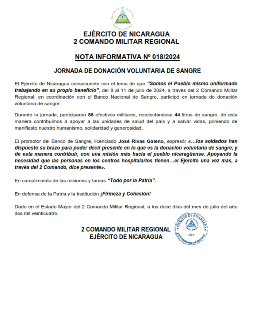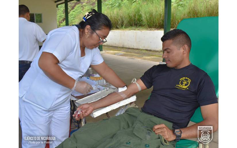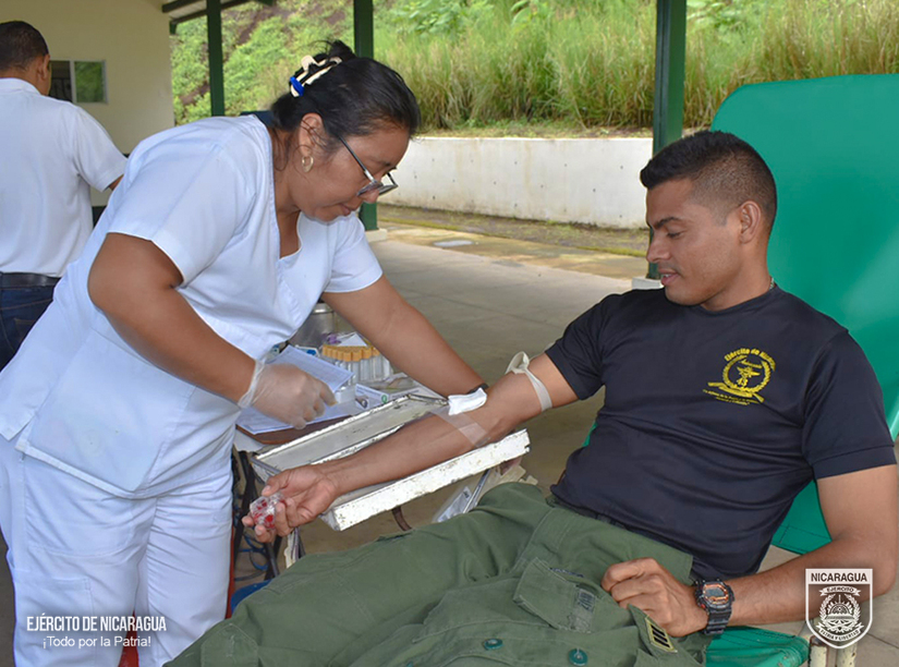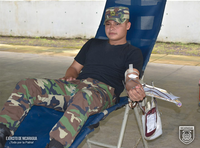 El Ejército de Nicaragua consecuente con el lema de que “Somos el Pueblo mismo uniformado trabajando en su propio beneficio”, del 8 al 11 de julio de 2024, a través del 2 Comando Militar Regional, en coordinación con el Banco Nacional de Sangre, participó en jornada de donación voluntaria de sangre.