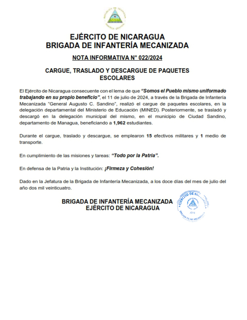 El Ejército de Nicaragua consecuente con el lema de que “Somos el Pueblo mismo uniformado trabajando en su propio beneficio”, el 11 de julio de 2024, a través de la Brigada de Infantería Mecanizada “General Augusto C. Sandino”, realizó el cargue de paquetes escolares, en la delegación departamental del Ministerio de Educación (MINED). Posteriormente, se trasladó y descargó en la delegación municipal del mismo, en el municipio de Ciudad Sandino, departamento de Managua, beneficiando a 1,962 estudiantes.
