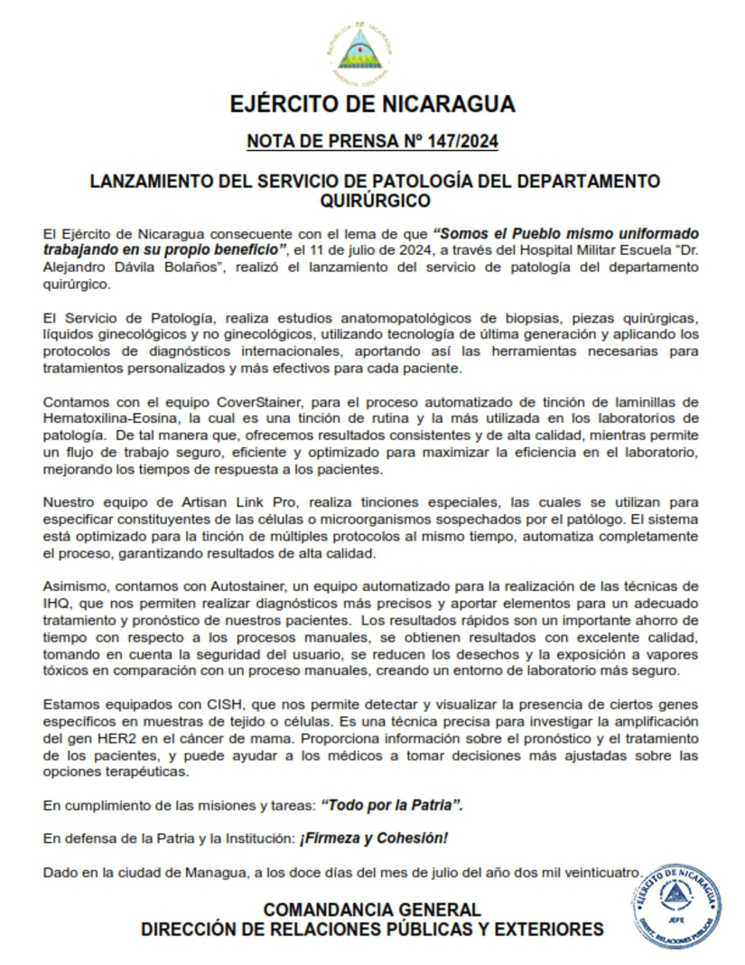 El Ejército de Nicaragua consecuente con el lema de que “Somos el Pueblo mismo uniformado trabajando en su propio beneficio”, el 11 de julio de 2024, a través del Hospital Militar Escuela “Dr. Alejandro Dávila Bolaños”, realizó el lanzamiento del servicio de patología del departamento quirúrgico.