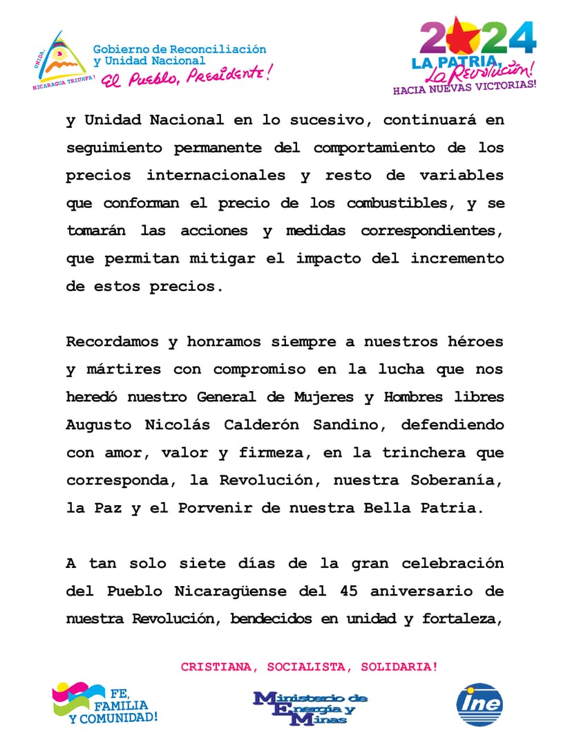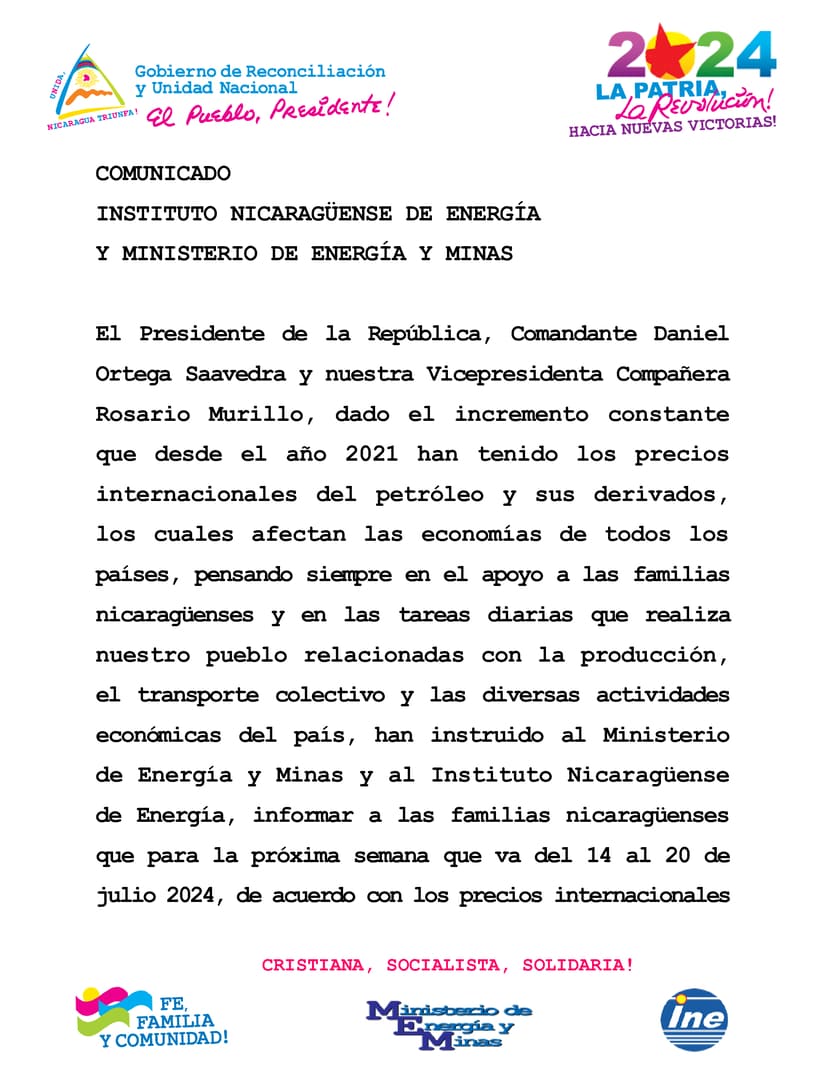 El Presidente de la República, Comandante Daniel Ortega Saavedra y nuestra Vicepresidenta Compañera Rosario Murillo, dado el incremento constante que desde el año 2021 han tenido los precios internacionales del petróleo y sus derivados, los cuales afectan las economías de todos los países, pensando siempre en el apoyo a las familias nicaragüenses y en las tareas diarias que realiza nuestro pueblo relacionadas con la producción, el transporte colectivo y las diversas actividades económicas del país, han instruido al Ministerio de Energía y Minas y al Instituto Nicaragüense de Energía, informar a las familias nicaragüenses que para la próxima semana que va del 14 al 20 de julio 2024, de acuerdo con los precios internacionales de los derivados del petróleo, los ajustes que se requieran no serán aplicados, manteniéndose los precios locales de los combustibles gasolinas y diésel sin variación, para beneficio de las familias nicaragüenses.
