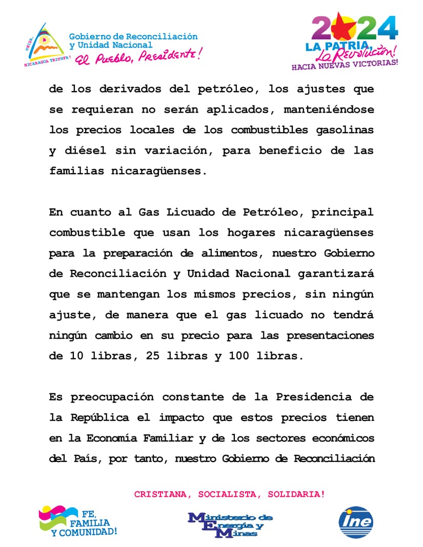En cuanto al Gas Licuado de Petróleo, principal combustible que usan los hogares nicaragüenses para la preparación de alimentos, nuestro Gobierno de Reconciliación y Unidad Nacional garantizará que se mantengan los mismos precios, sin ningún ajuste, de manera que el gas licuado no tendrá ningún cambio en su precio para las presentaciones de 10 libras, 25 libras y 100 libras.