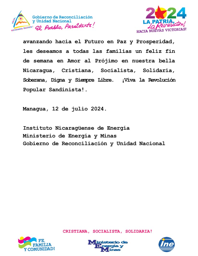 A tan solo siete días de la gran celebración del Pueblo Nicaragüense del 45 aniversario de nuestra Revolución, bendecidos en unidad y fortaleza, avanzando hacia el Futuro en Paz y Prosperidad, les deseamos a todas las familias un feliz fin de semana en Amor al Prójimo en nuestra bella Nicaragua, Cristiana, Socialista, Solidaria, Soberana, Digna y Siempre Libre. ¡Viva la Revolución Popular Sandinista!.