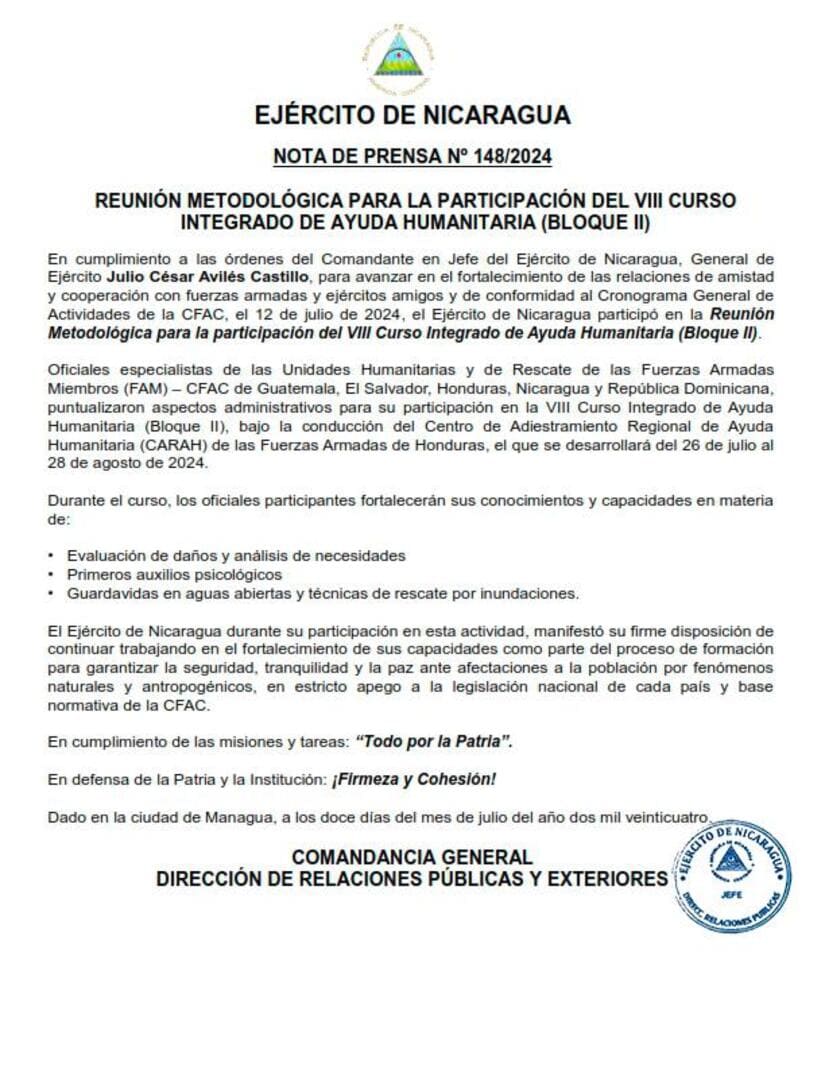 En cumplimiento a las órdenes del Comandante en Jefe del Ejército de Nicaragua, General de Ejército Julio César Avilés Castillo, para avanzar en el fortalecimiento de las relaciones de amistad y cooperación con fuerzas armadas y ejércitos amigos y de conformidad al Cronograma General de Actividades de la CFAC, el 12 de julio de 2024, el Ejército de Nicaragua participó en la Reunión Metodológica para la participación del VIII Curso Integrado de Ayuda Humanitaria (Bloque II).