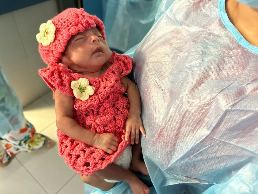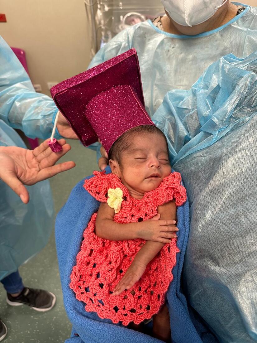 Ella tenía un embarazo de alto riesgo obstétrico, por presentar diabetes gestacional y restricción de crecimiento intra uterino, fue necesario interrumpir su embarazo a los 7 meses de embarazo, con un peso al nacimiento de 545 gramos.