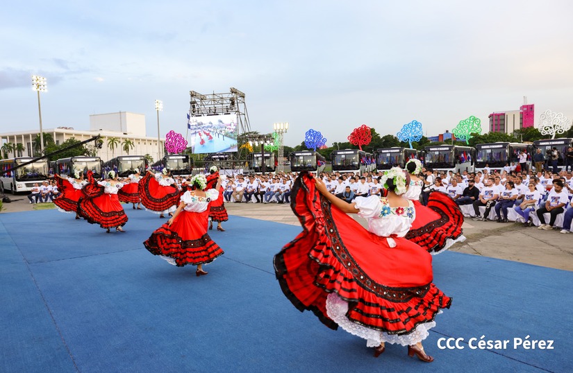 El Presidente de la República, Comandante Daniel Ortega y la Vicepresidenta Compañera Rosario Murillo, presiden el acto de la entrega de 250 autobuses provenientes de la República Popular China a 28 cooperativas de Managua, en saludo al 45 aniversario de la Revolución Popular Sandinista.
