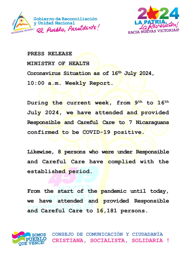 During the current week, from 9th to 16th July 2024, we have attended and provided Responsible and Careful Care to 7 Nicaraguans confirmed to be COVID-19 positive.