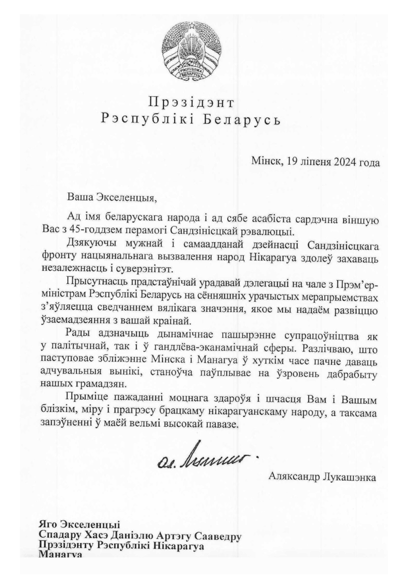 Mensaje de Felicitaciones del Compañero Aleksandr Lukashenko, Presidente de la República de Bielorrusia, a nuestro Pueblo y Gobierno, al conmemorarse 45 Años de la Revolución Popular Sandinista.