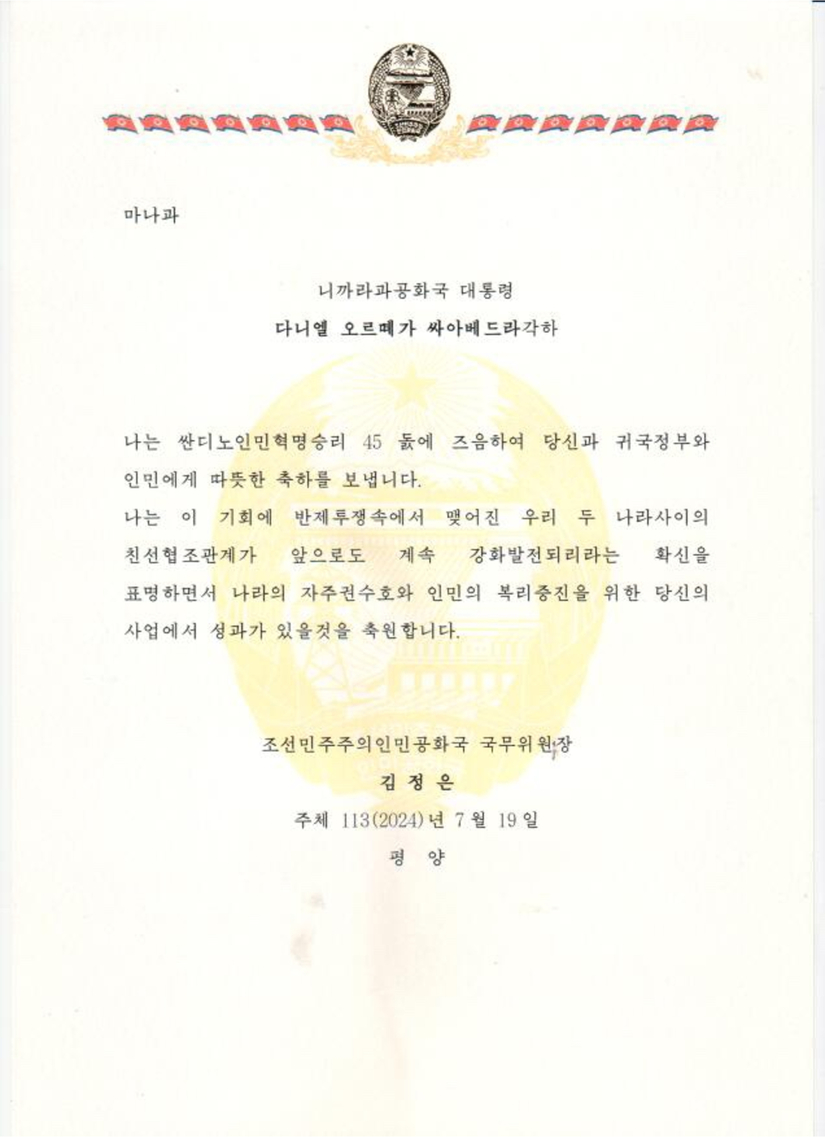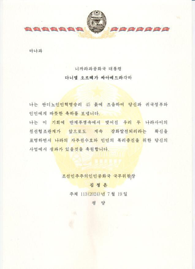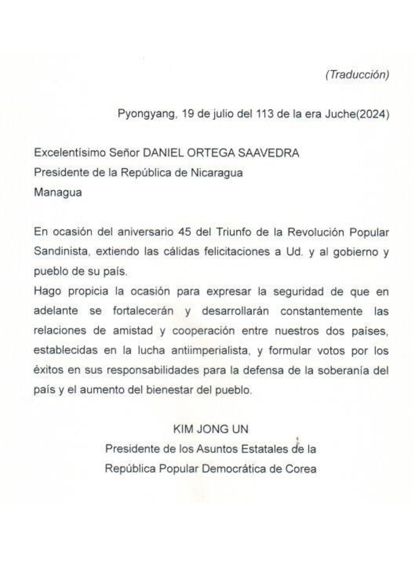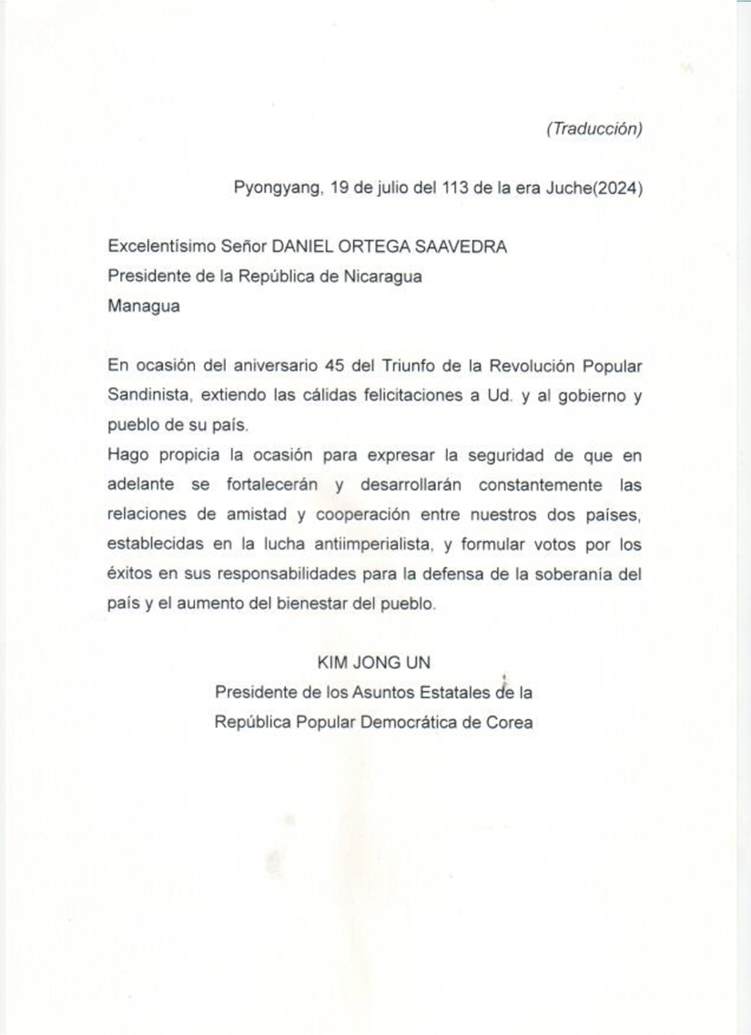 Mensaje de Felicitaciones del Camarada Kim Jong Un, Presidente de los Asuntos Estatales de la República Popular Democrática de Corea, a nuestro Pueblo y Gobierno, con motivo del 45 Aniversario de la Revolución Popular Sandinista.