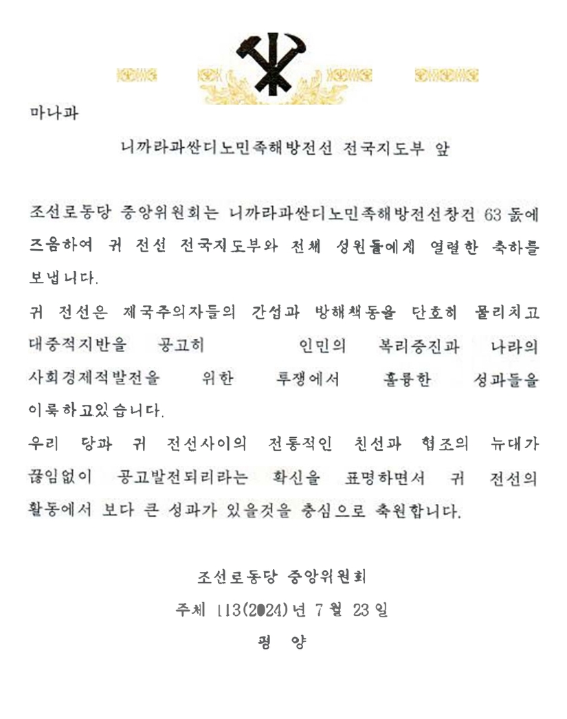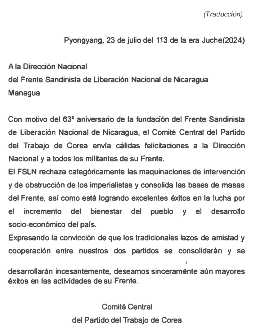 Con motivo del 63º aniversario de la fundación del Frente Sandinista de Liberación Nacional de Nicaragua, el Comité Central del Partido del Trabajo de Corea envía cálidas felicitaciones a la Dirección Nacional y a todos los militantes de su Frente.