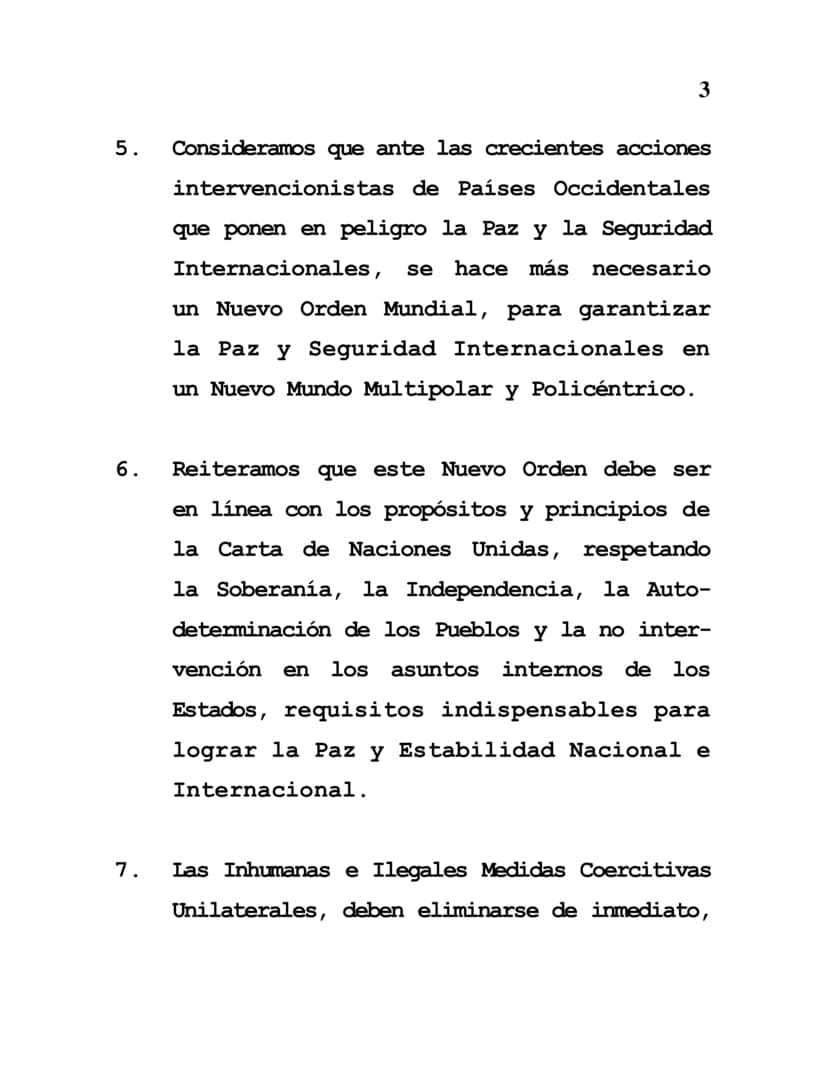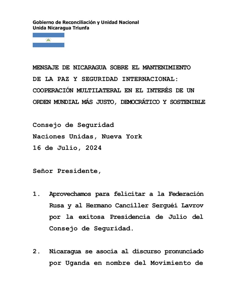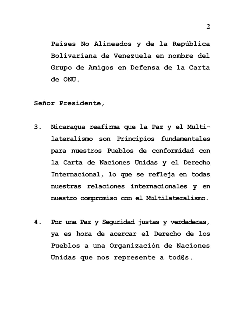 Nicaragua señaló que ante las crecientes acciones intervencionistas de Países occidentales que ponen en peligro la Paz y la Seguridad Internacionales, se hace más necesario un Nuevo Orden Mundial, para garantizar la Paz y Seguridad Internacionales en un Nuevo Mundo Multipolar y Policéntrico.