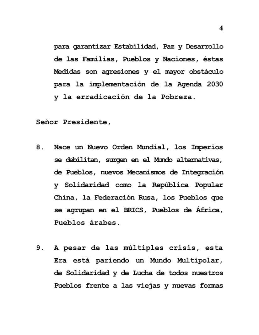 El Compañero Hermida denunció las inhumanas e ilegales Medidas Coercitivas Unilaterales, las cuales deben eliminarse de inmediato, para garantizar Estabilidad, Paz y Desarrollo de las Familias, Pueblos y Naciones, estas medidas son agresiones y el mayor obstáculo para la implementación de la Agenda 2030 y la erradicación de la Pobreza.