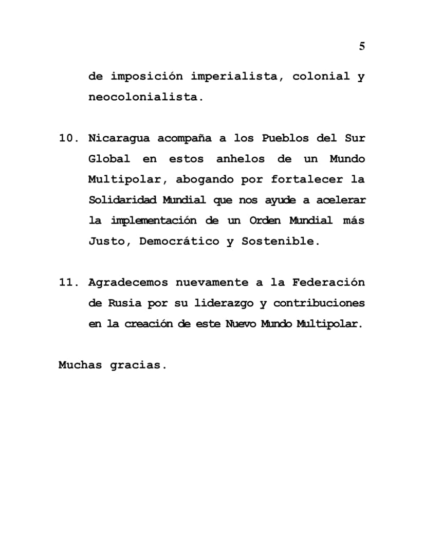 Nicaragua acompaña a los Pueblos del Sur Global en estos anhelos de un Mundo Multipolar, abogando por fortalecer la Solidaridad Mundial que nos ayude a acelerar la implementación de un Orden Mundial más Justo, Democrático y Sostenible.